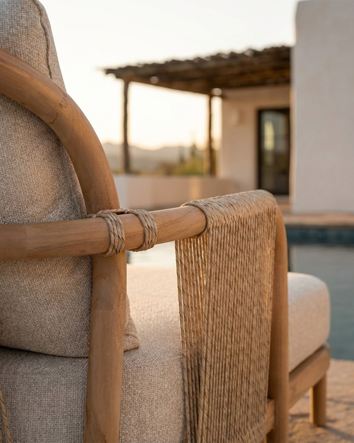 La col·lecció Aturades està realitzada amb materials premium pensats per a l'exterior. Fusta de teca de forma cilíndrica corbada en combinació amb corda de ratà sintètic de 4,8mm i coixins texturitzats. Tot això crea una família de productes espectacular, amb formes molt orgàniques i ergonòmiques. Enriqueix qualsevol espai amb la gamma Aturades ja que els seus tons neutres combinen a la perfecció en qualsevol estada i ambient.