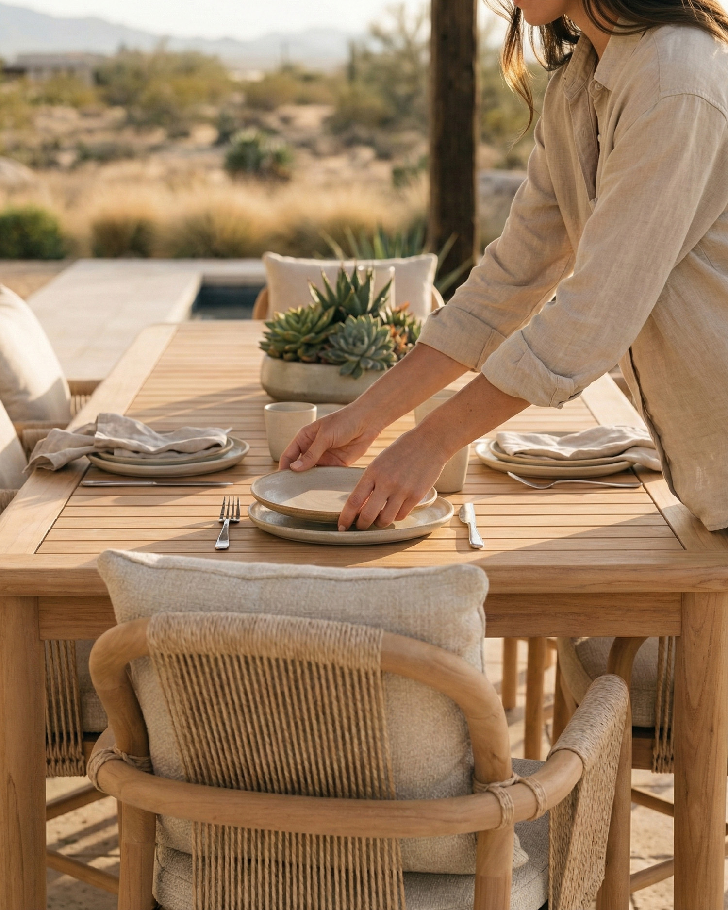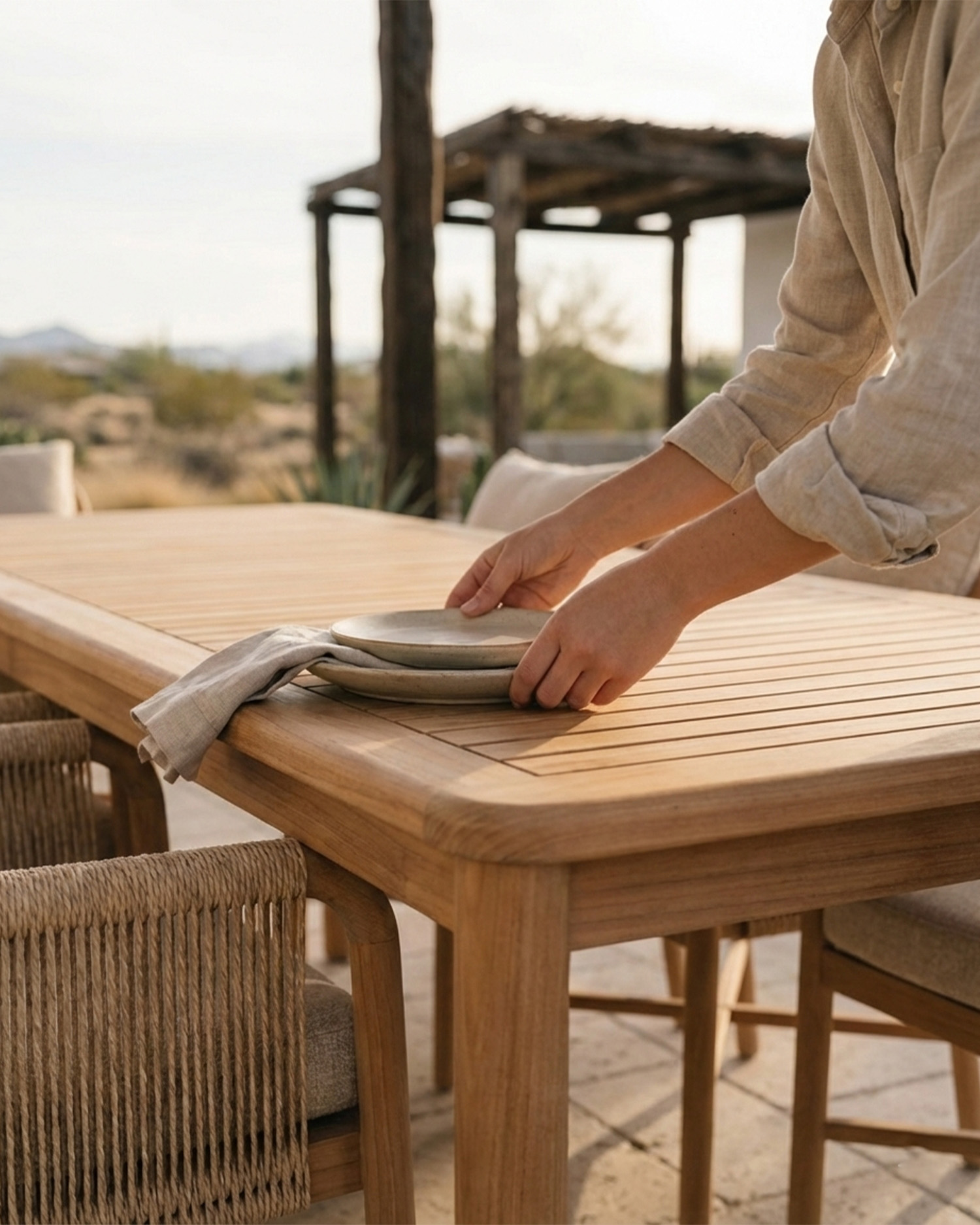 La col·lecció Aturades està realitzada amb materials premium pensats per a l'exterior. Fusta de teca de forma cilíndrica corbada en combinació amb corda de ratà sintètic de 4,8mm i coixins texturitzats. Tot això crea una família de productes espectacular, amb formes molt orgàniques i ergonòmiques. Enriqueix qualsevol espai amb la gamma Aturades ja que els seus tons neutres combinen a la perfecció en qualsevol estada i ambient.