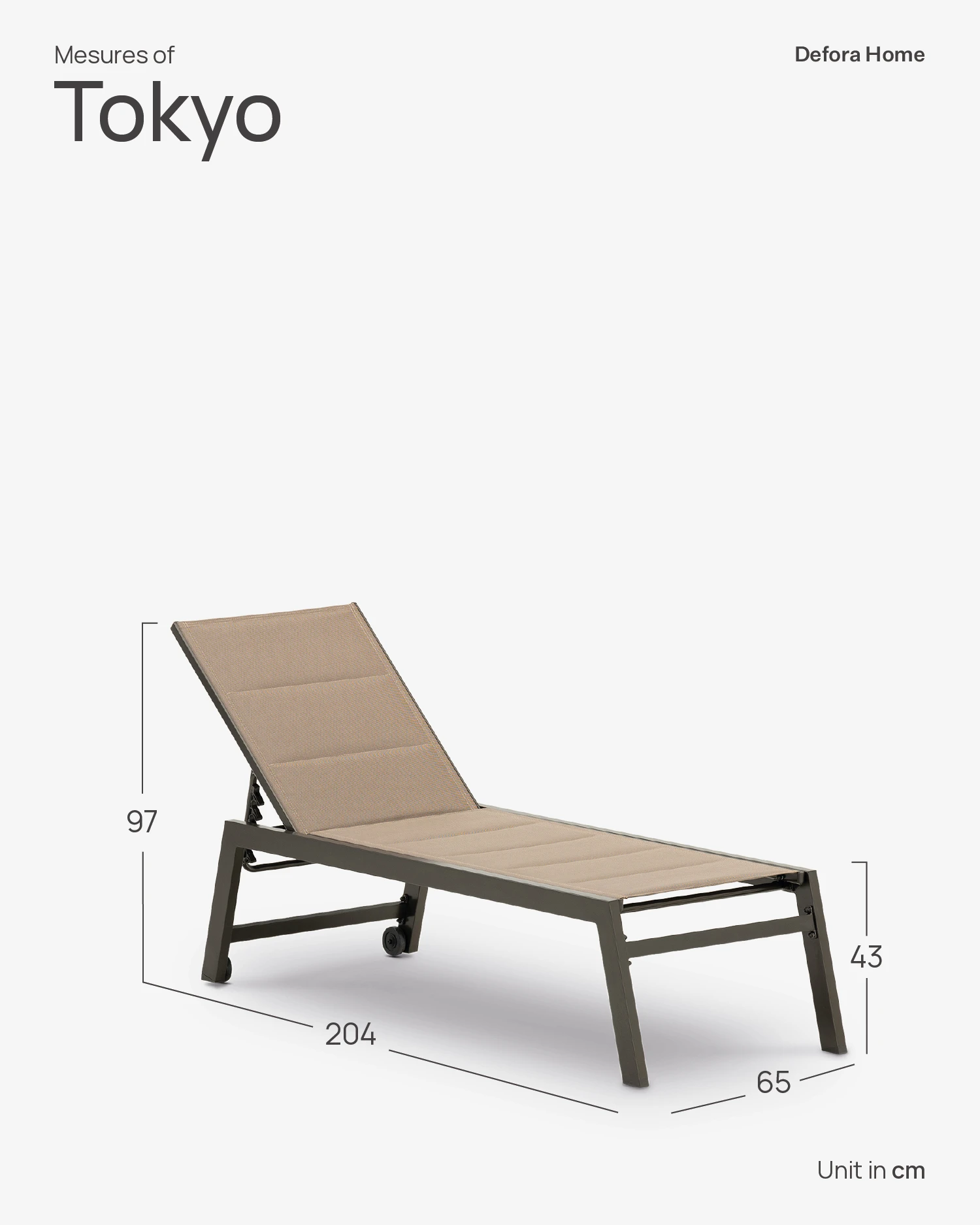 Tumbona d' exterior per a jardí o terrassa fabricada amb una estructura d' alumini i tèxtil encoixinat al respatller i seient. Podràs regular el recolzament fins a 5 posicions per col·locar la tombona com et resulti més confortable. Està tomb permet estar tombat pla al 100% la qual cosa és molt important o a l'hora de prendre el sol d'esquena. Inclou 2 rodes per moure i desplaçar la tombona amb total facilitat. L'altura de la tombona d'alumini antracita és més alta de l'habitual el que es tradueix en què resulta molt còmode l'asseure's i aixecar-se.