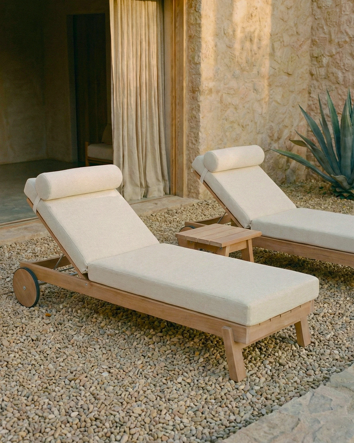 Tumbona de fusta amb coixí i rodes