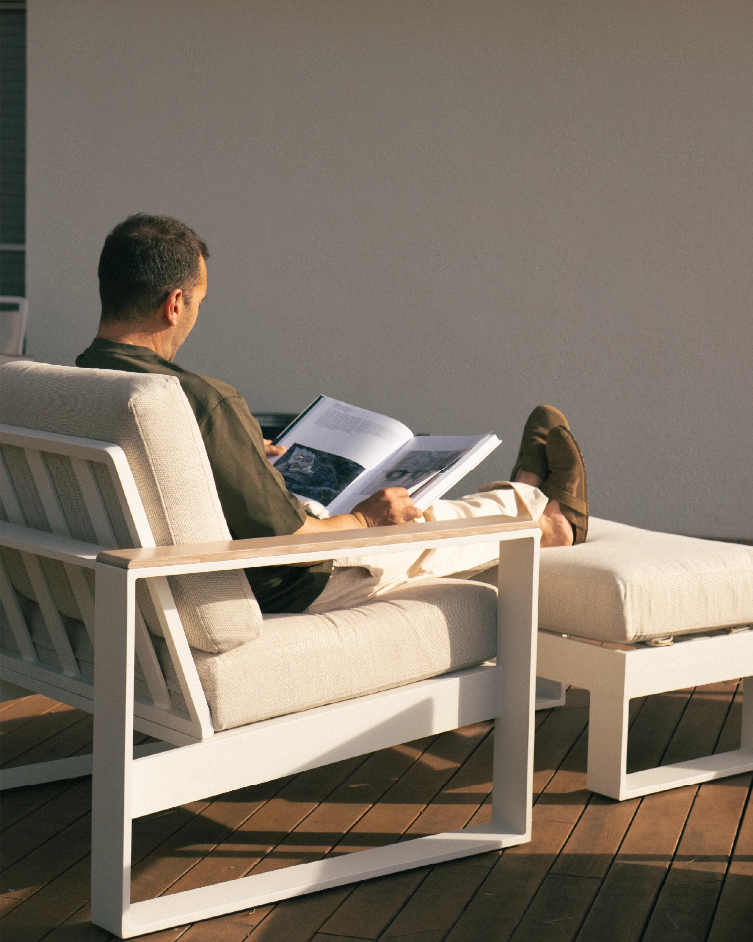 Set mit 2 Gartensesseln mit weißer Fußstütze