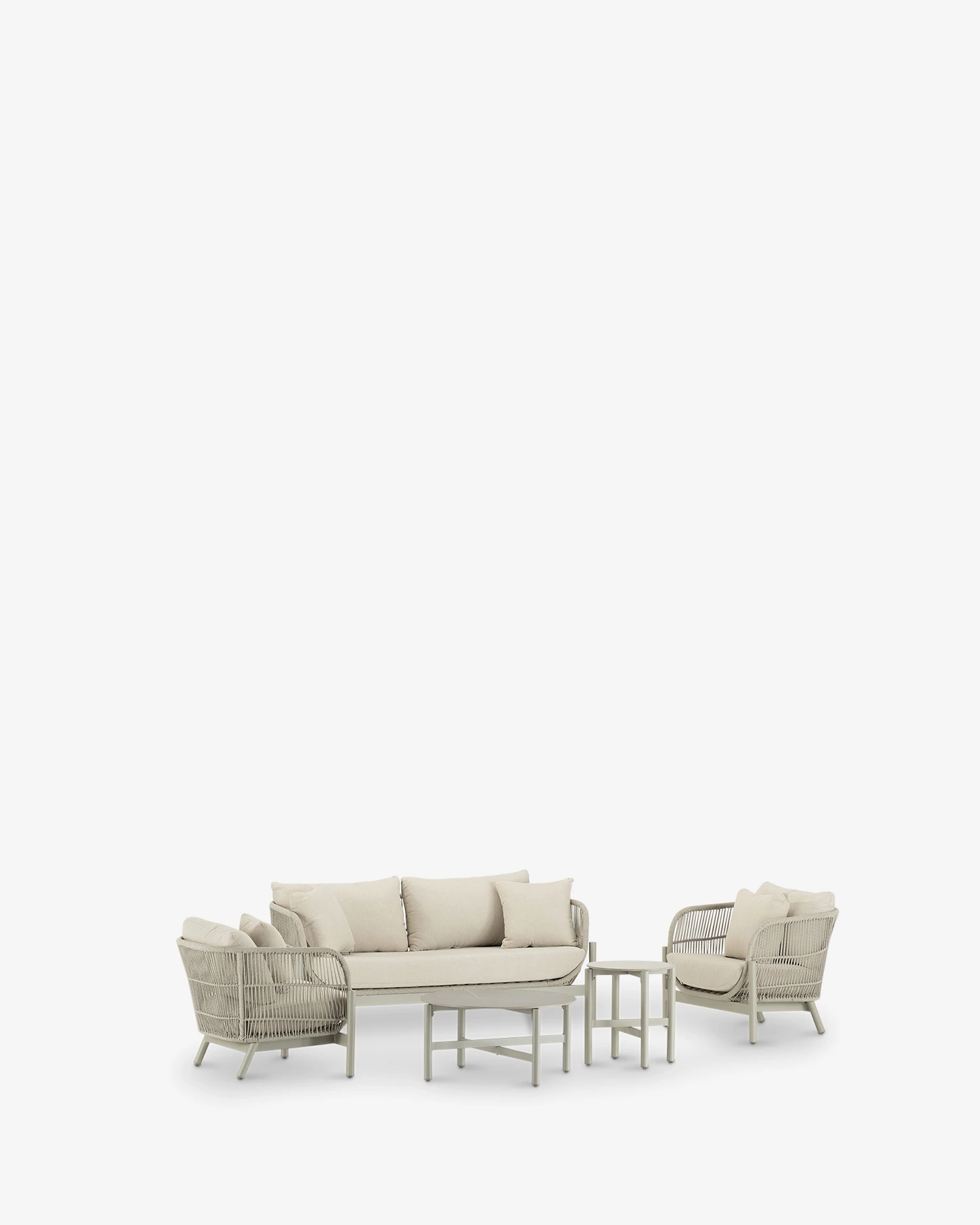 Die Kollektion Milos zeichnet sich durch die Schlichtheit ihrer Formen und geschwungenen Linien aus. Neutrale und elegante Töne; Der Mix aus Materialien, Stoff, Aluminium und Seil harmoniert in jedem Raum.