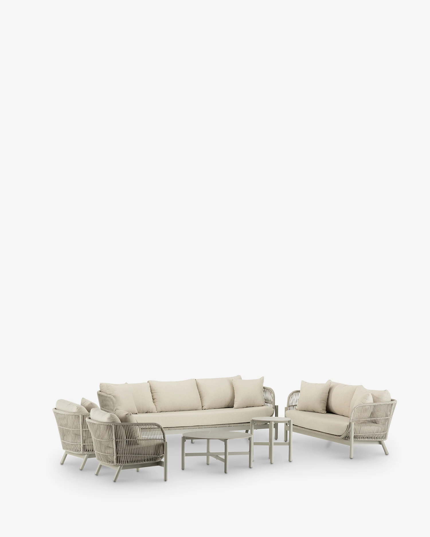 Das Sofa und die Sessel sind aus einer sehr widerstandsfähigen Aluminiumstruktur gefertigt. Das handgeflochtene Seil befindet sich an den Seiten und der Rückenlehne. Die Kissen sind von hoher Dicke und bieten eine weiche und flauschige Oberfläche, auf der Sie bequem sitzen können. Darüber hinaus sind sie für eine einfache Reinigung abnehmbar.