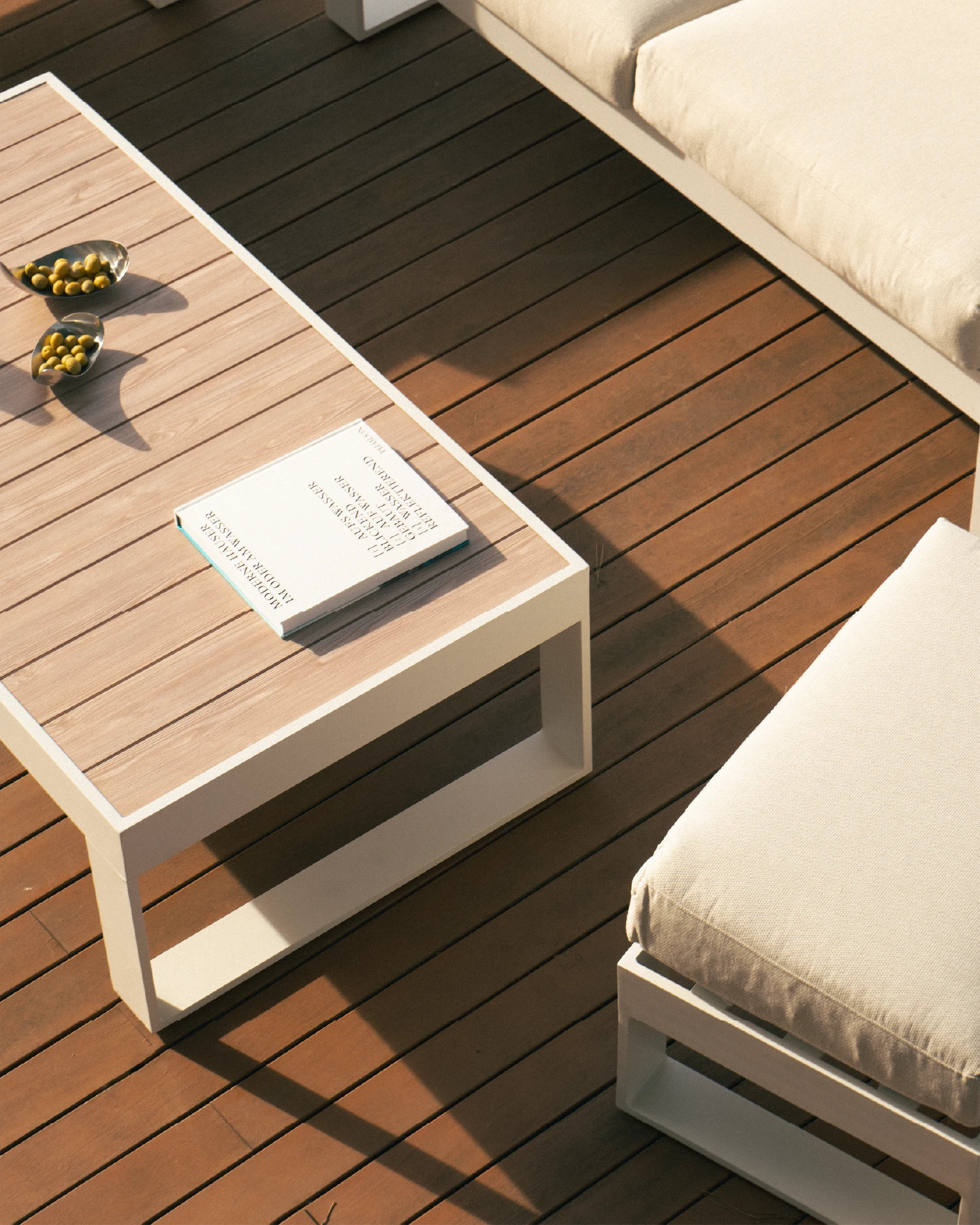 Die Manhattan-Kollektion ist geradlinig, modern und minimalistisch in der Linie. Aus Aluminium gefertigt und mit einem Hauch von Wärme durch Armlehnen und Tischplatten, die Holz imitieren und zudem mit strukturiertem Stoff polstern.