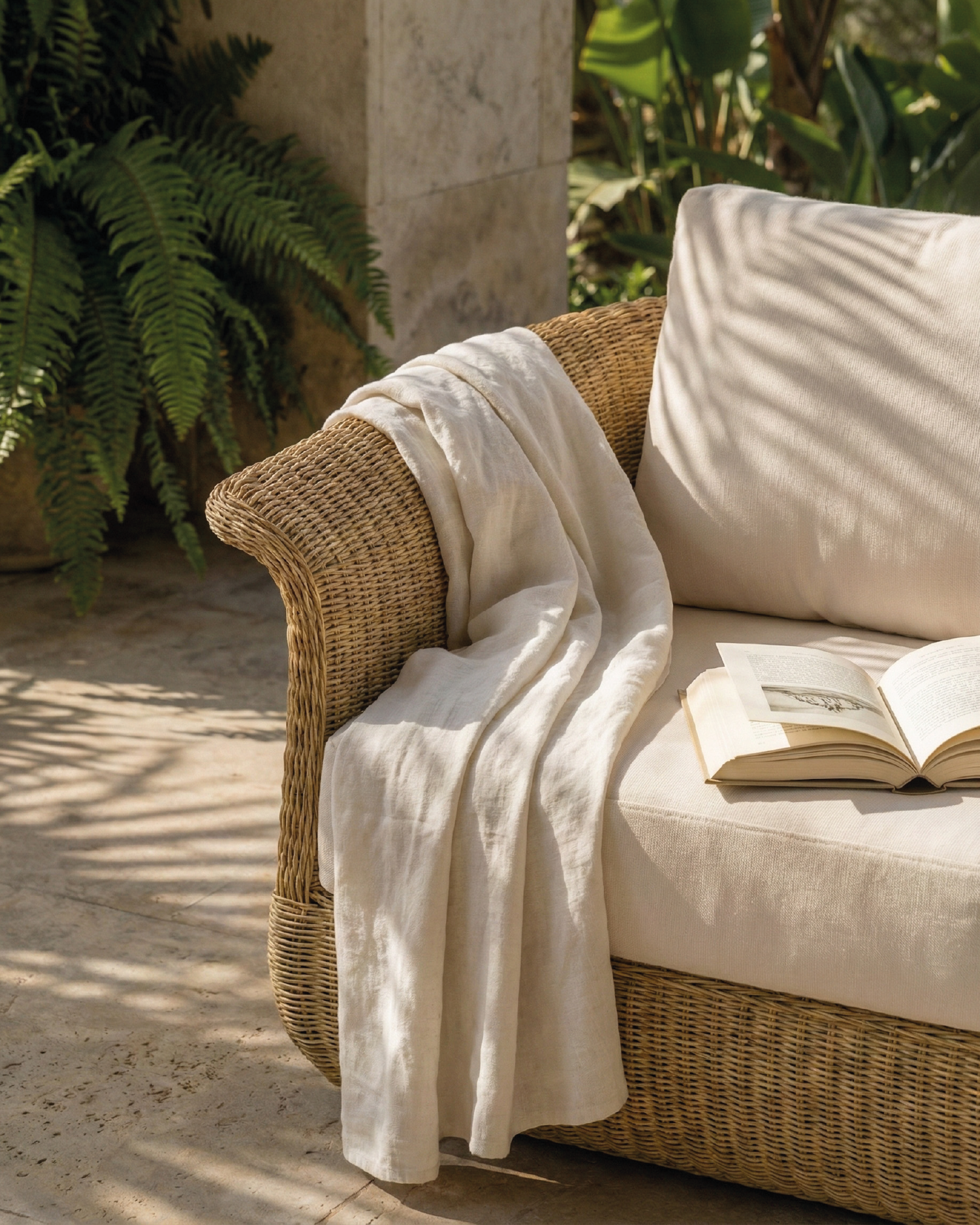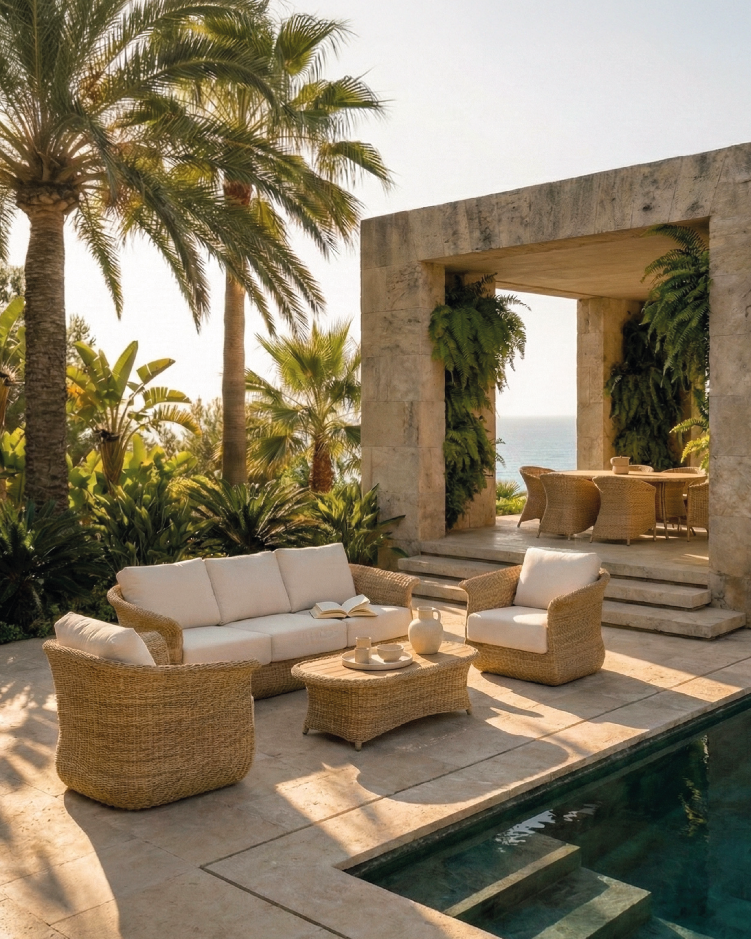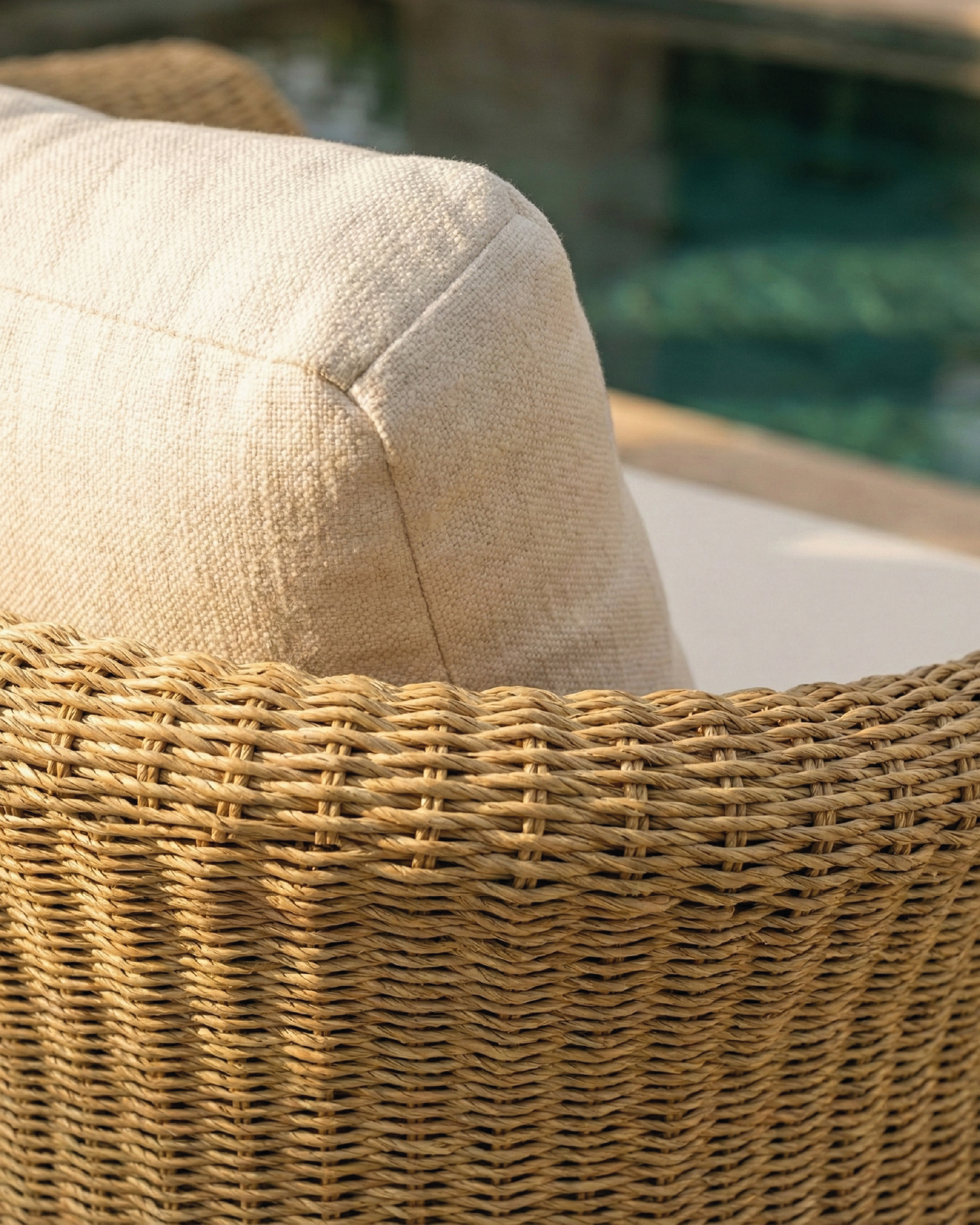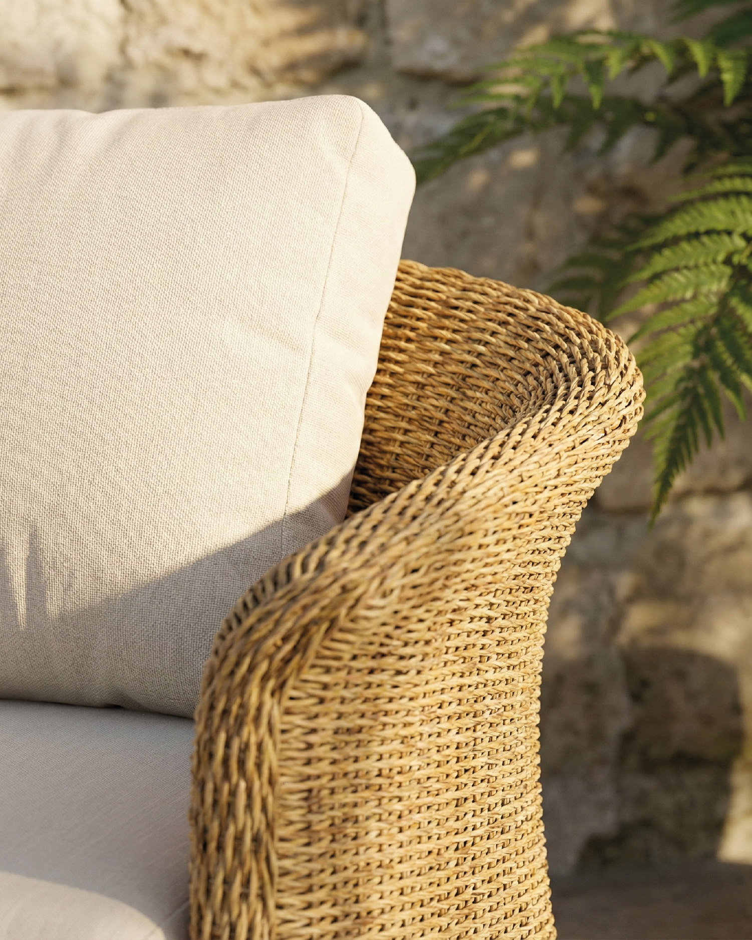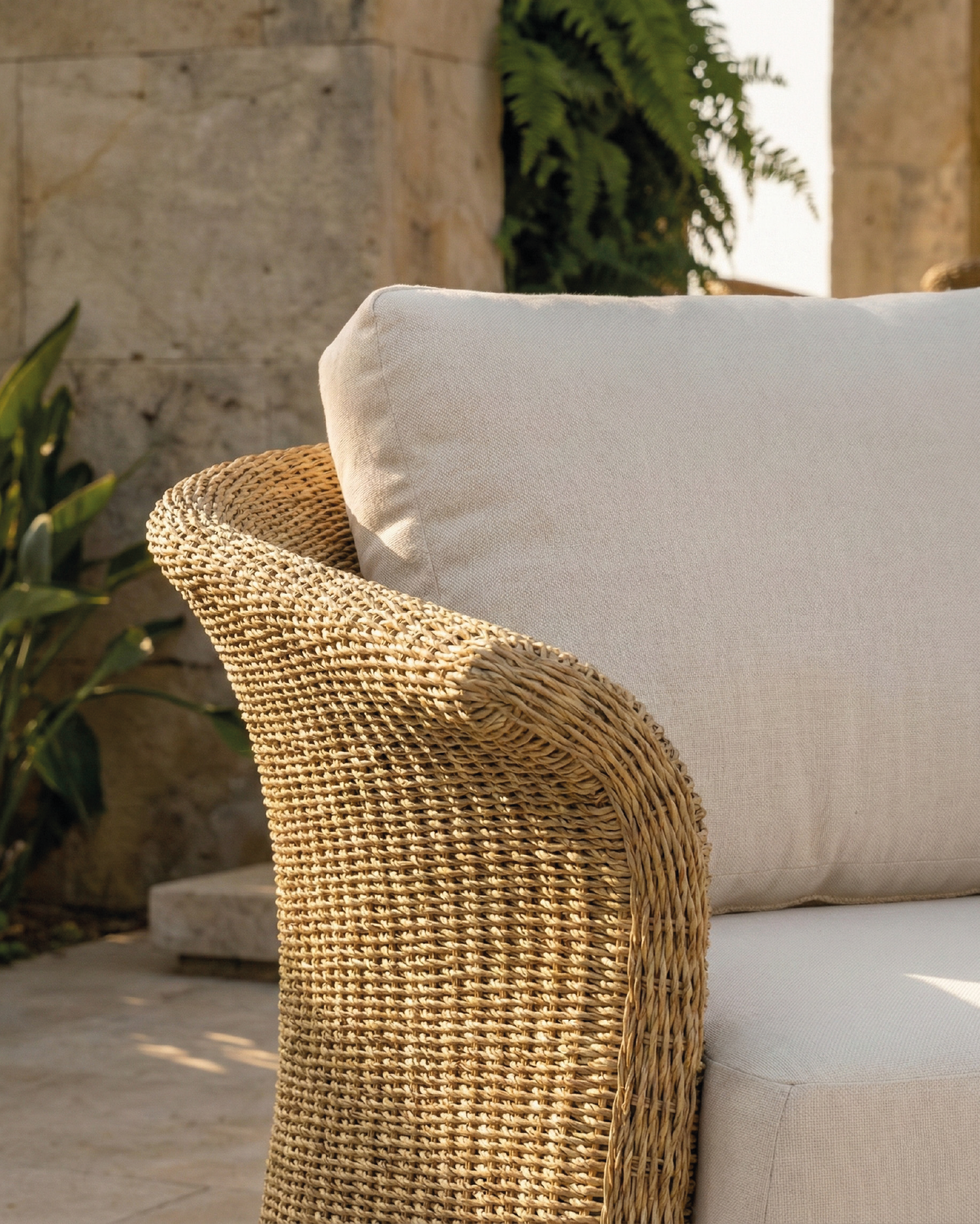 Die Kollektion Palma basiert auf Linien, die die Natur ausstrahlen, mit abgerundeten Formen und weichen Kurven, die durch das handgeflochtene synthetische Rattan gezogen werden. Mit rohen Farbkissen, die sich der konturierten Form der Möbel anpassen und den nötigen Komfort bieten, um das Leben im Freien zu genießen.
