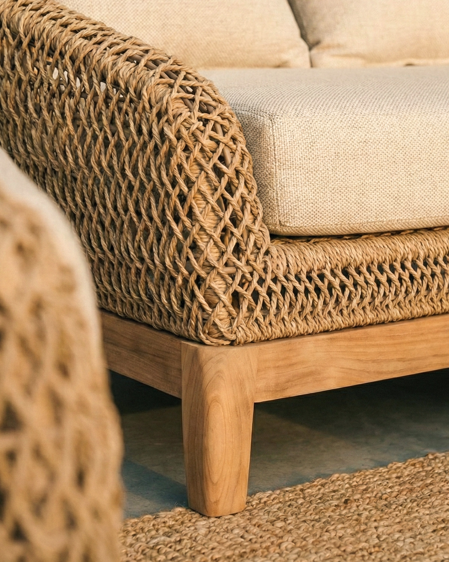 The Zante collection is made with premium materials designed for the outdoors. The structure of teak wood and aluminum in combination with 4.8mm synthetic rattan rope from the prestigious German brand Rehau that give volume and transparency to the collection. All this creates a spectacular family of products, with very organic and ergonomic shapes.