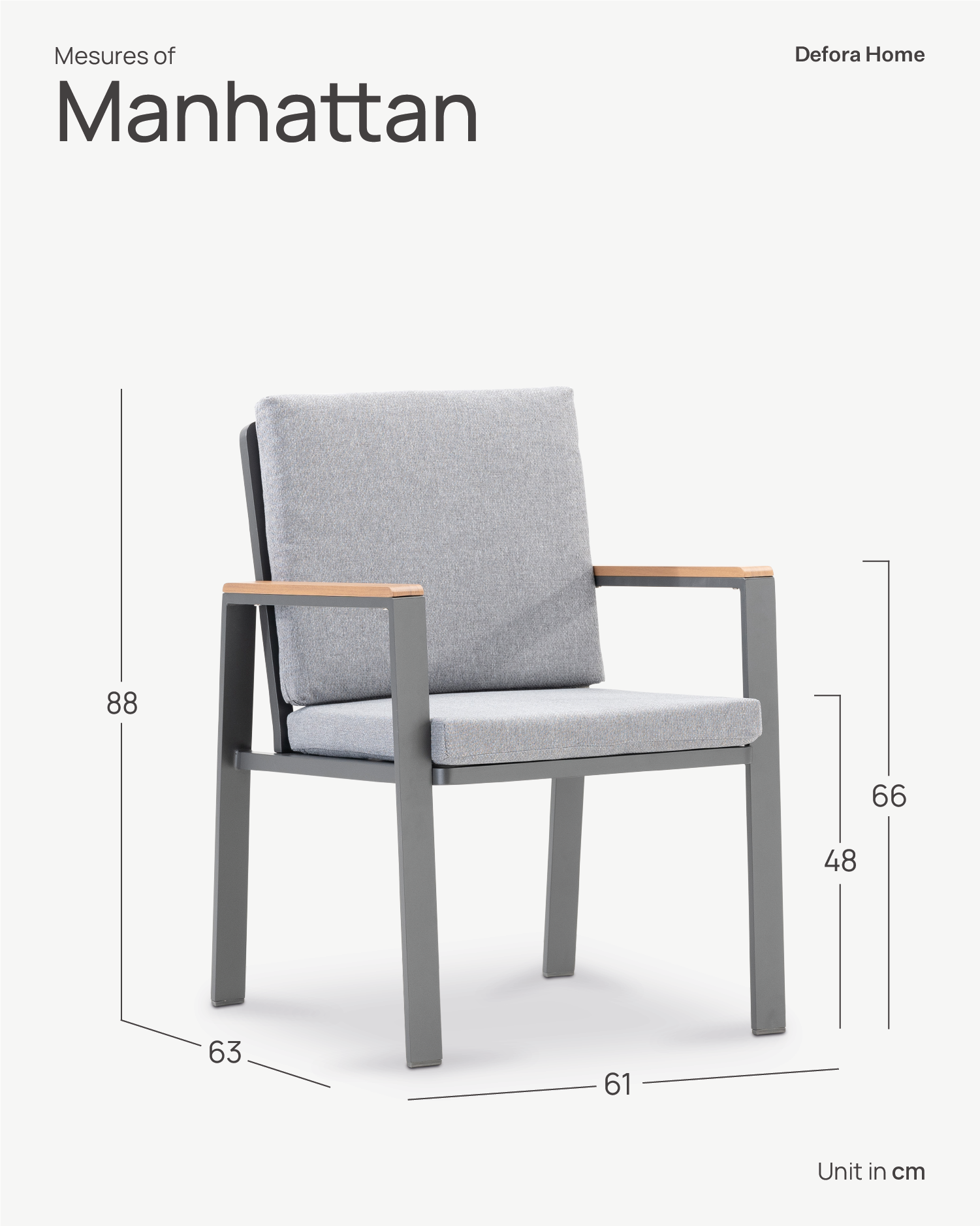 The Manhattan collection is straight, modern and minimalist in line. Made of aluminum and a touch of warmth provided by both its arms and table tops, imitating wood as well as cushioning with textured fabric.