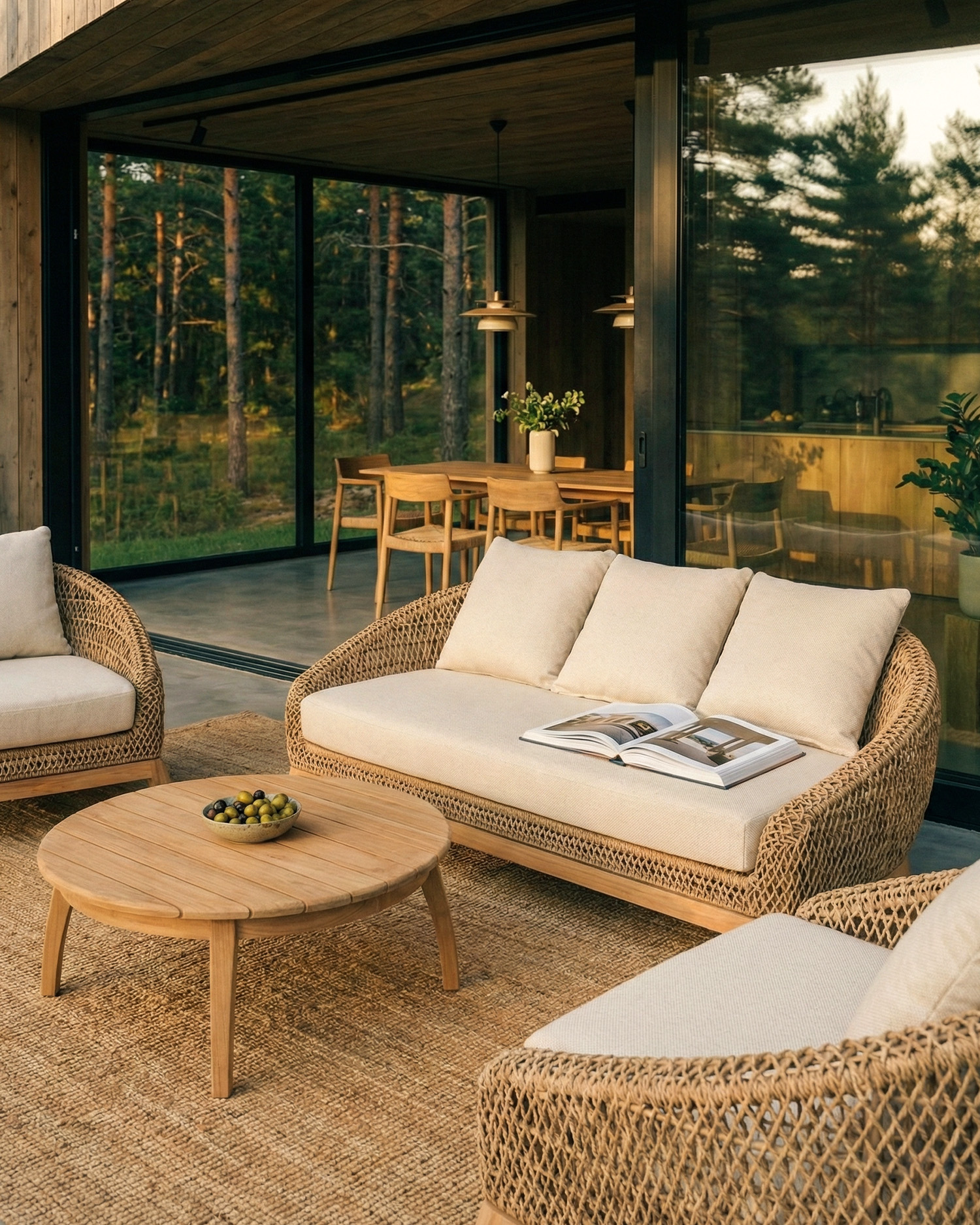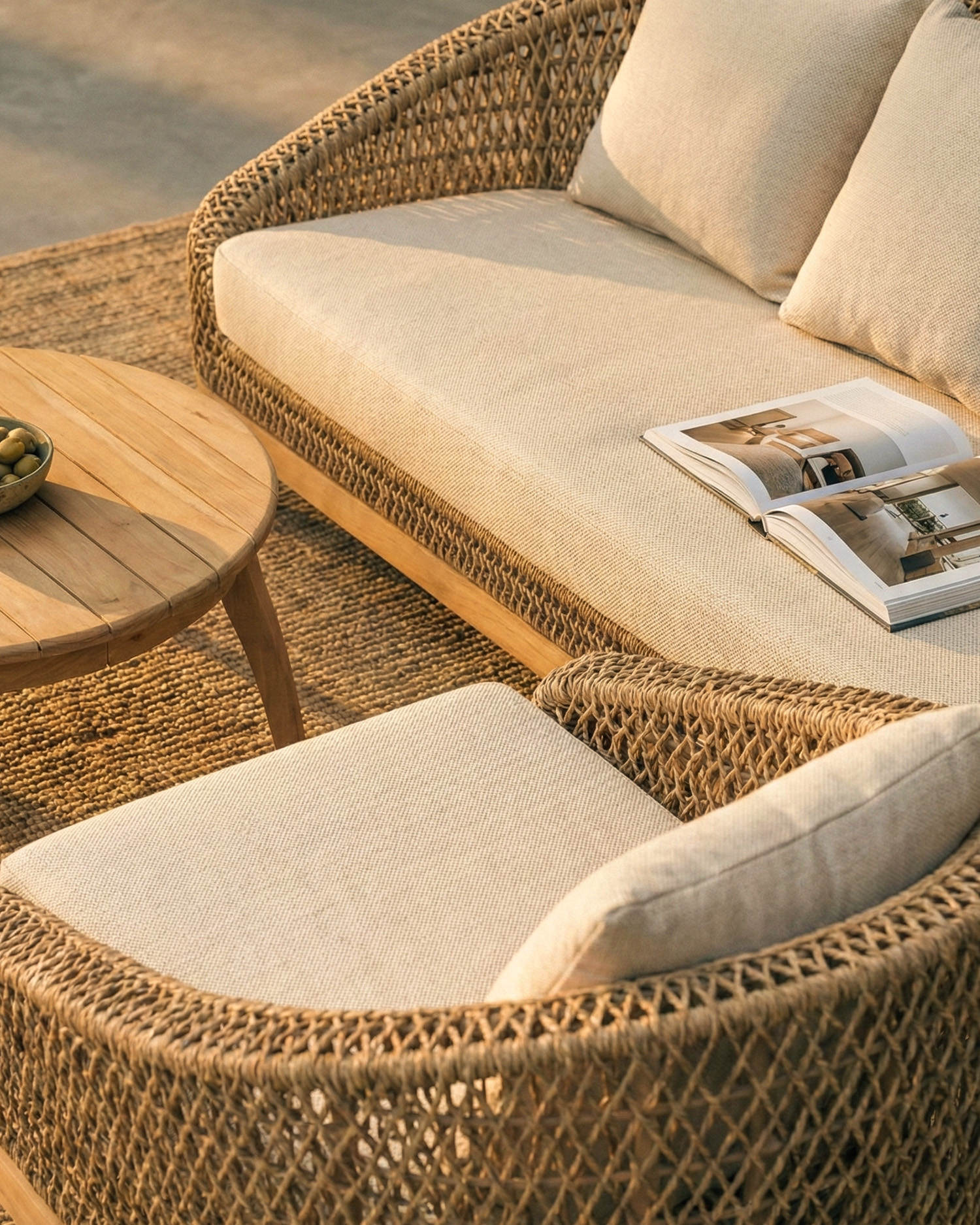 The Zante collection is made with premium materials designed for the outdoors. The structure of teak wood and aluminum in combination with 4.8mm synthetic rattan rope from the prestigious German brand Rehau that give volume and transparency to the collection. All this creates a spectacular family of products, with very organic and ergonomic shapes.
