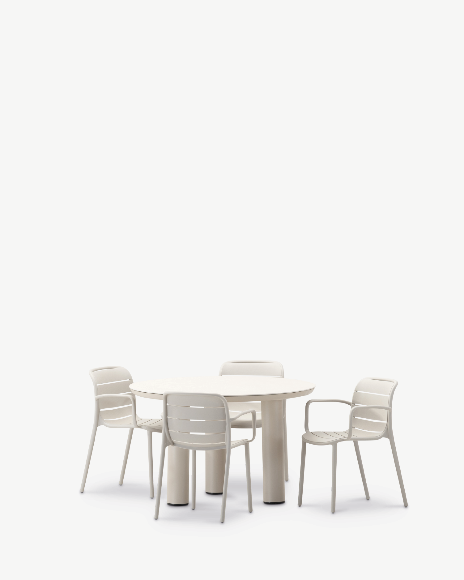 The table from the Petra collection with curved volumes and large cylinders, perfectly combines the modernity of aluminum with the warmth of beige ceramic top. In the Petra collection you will find round dining tables and side tables.