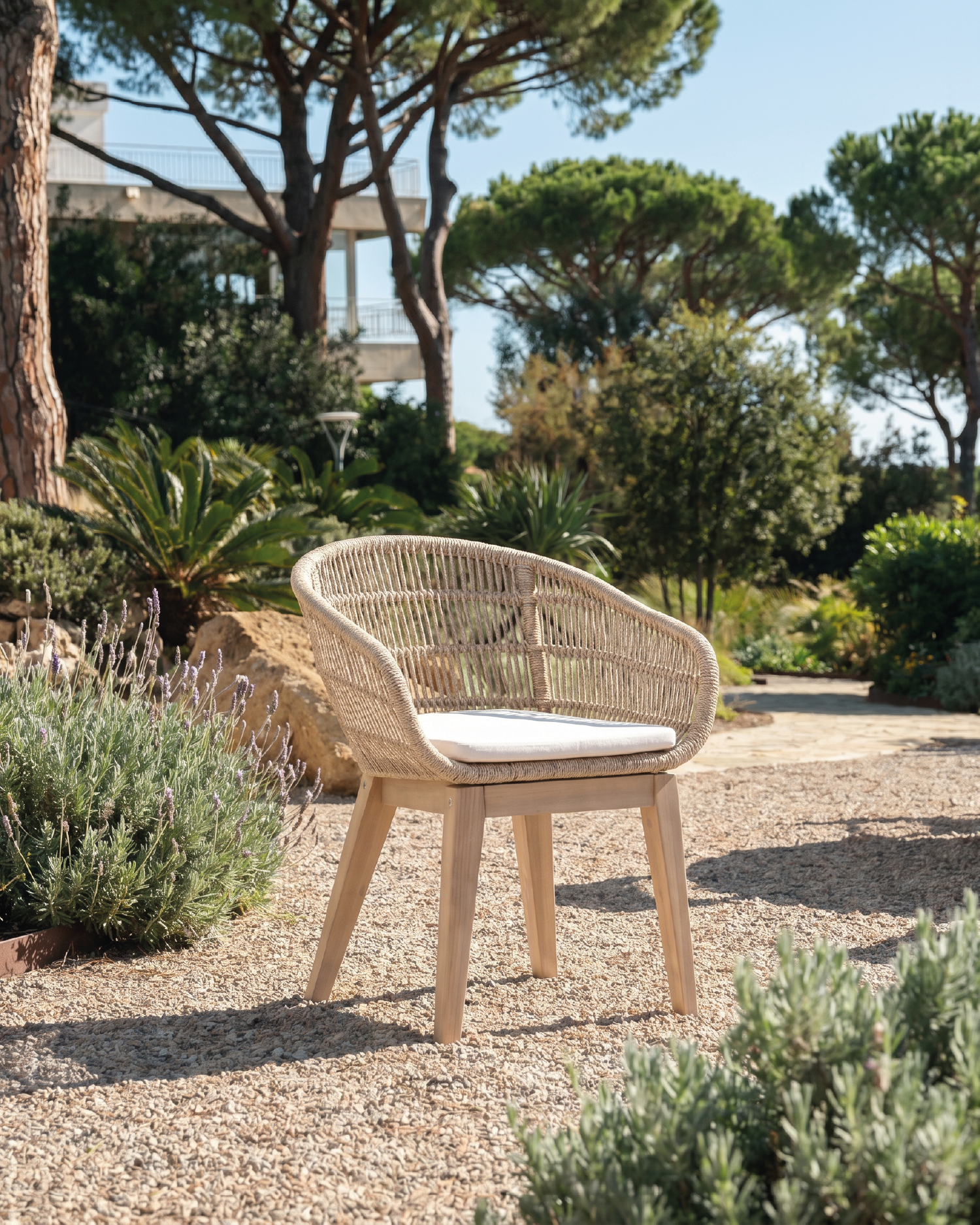 Esta gama de muebles de jardín destaca por sus piezas de líneas curvas y envolventes. Un mobiliario de exterior que cuenta con una mezcla perfecta de materiales, combinando a la perfección una madera de color claro con terrazo y distintos tejidos tipo cuerda. Acompañada de cojines desenfundables en tonos crudos y neutros, los elementos de descanso del muestrario Provenza adquieren una estética única junto al máximo confort.