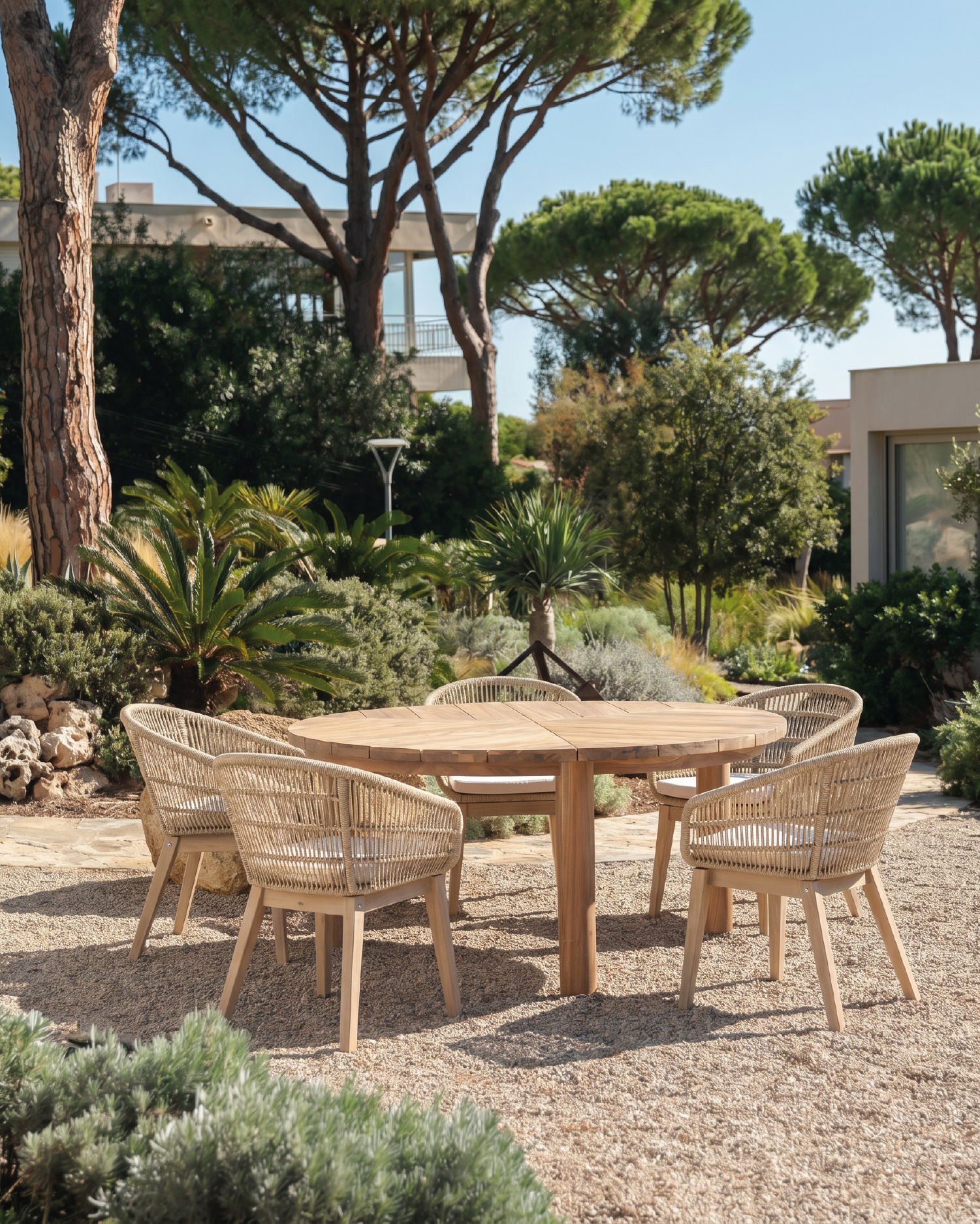 Esta gama de muebles de jardín destaca por sus piezas de líneas curvas y envolventes. Un mobiliario de exterior que cuenta con una mezcla perfecta de materiales, combinando a la perfección una madera de color claro con terrazo y distintos tejidos tipo cuerda. Acompañada de cojines desenfundables en tonos crudos y neutros, los elementos de descanso del muestrario Provenza adquieren una estética única junto al máximo confort.