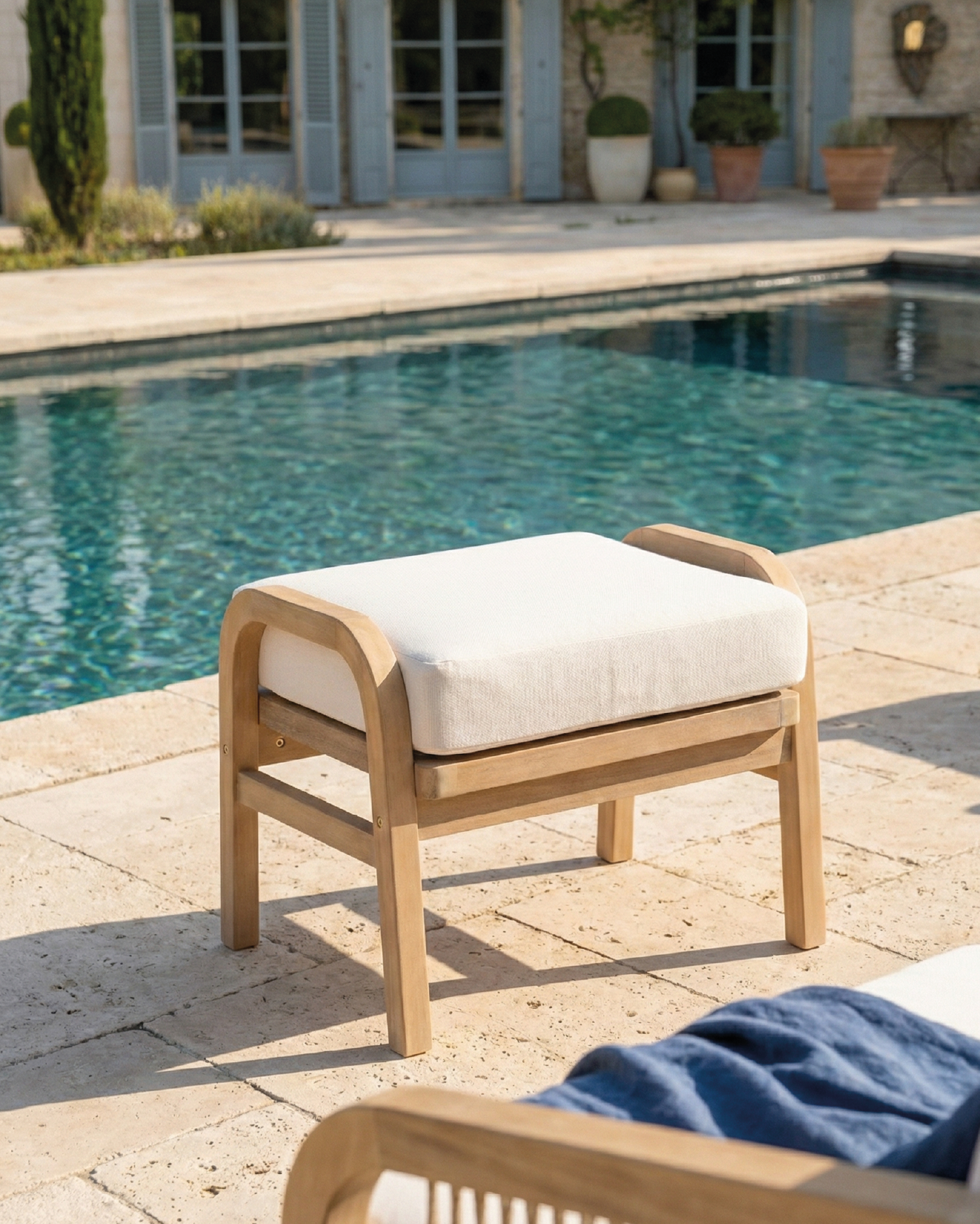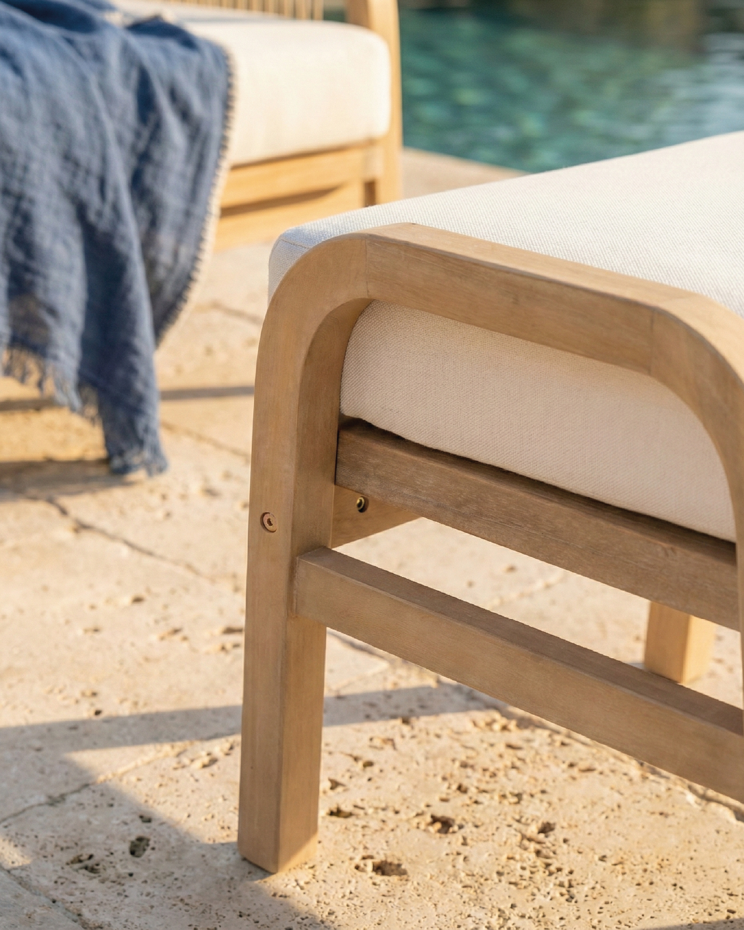 Los sillones Siena y reposapiés están fabricados con madera de acacia color clara y cuerda de poliéster trenzada a mano.