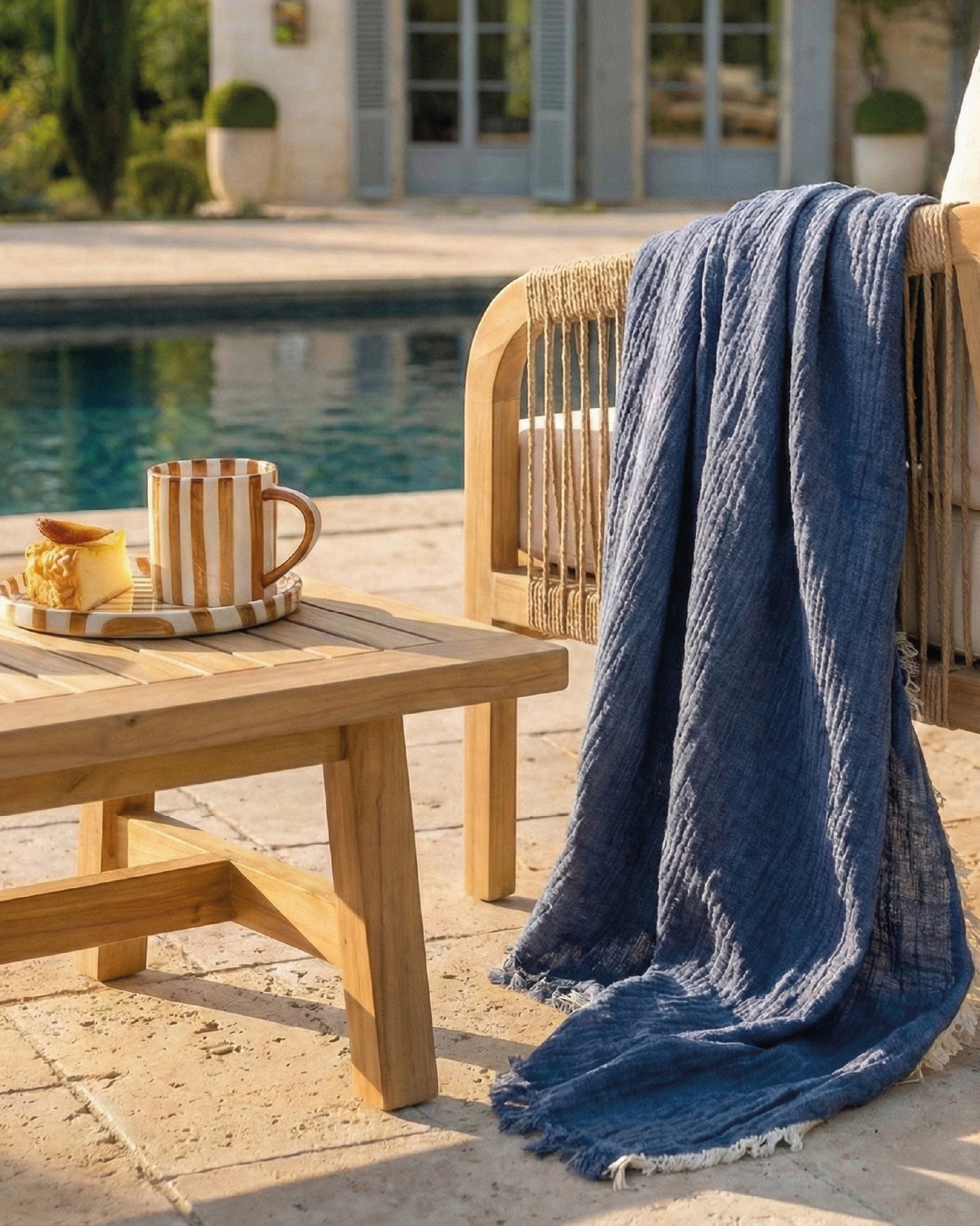 - Ciertamente, la estructura del sofá, los sillones y la mesa está fabricada en madera de acacia certificada FSC. Así pues, el material está gestionado de manera sostenible durante todo el proceso.