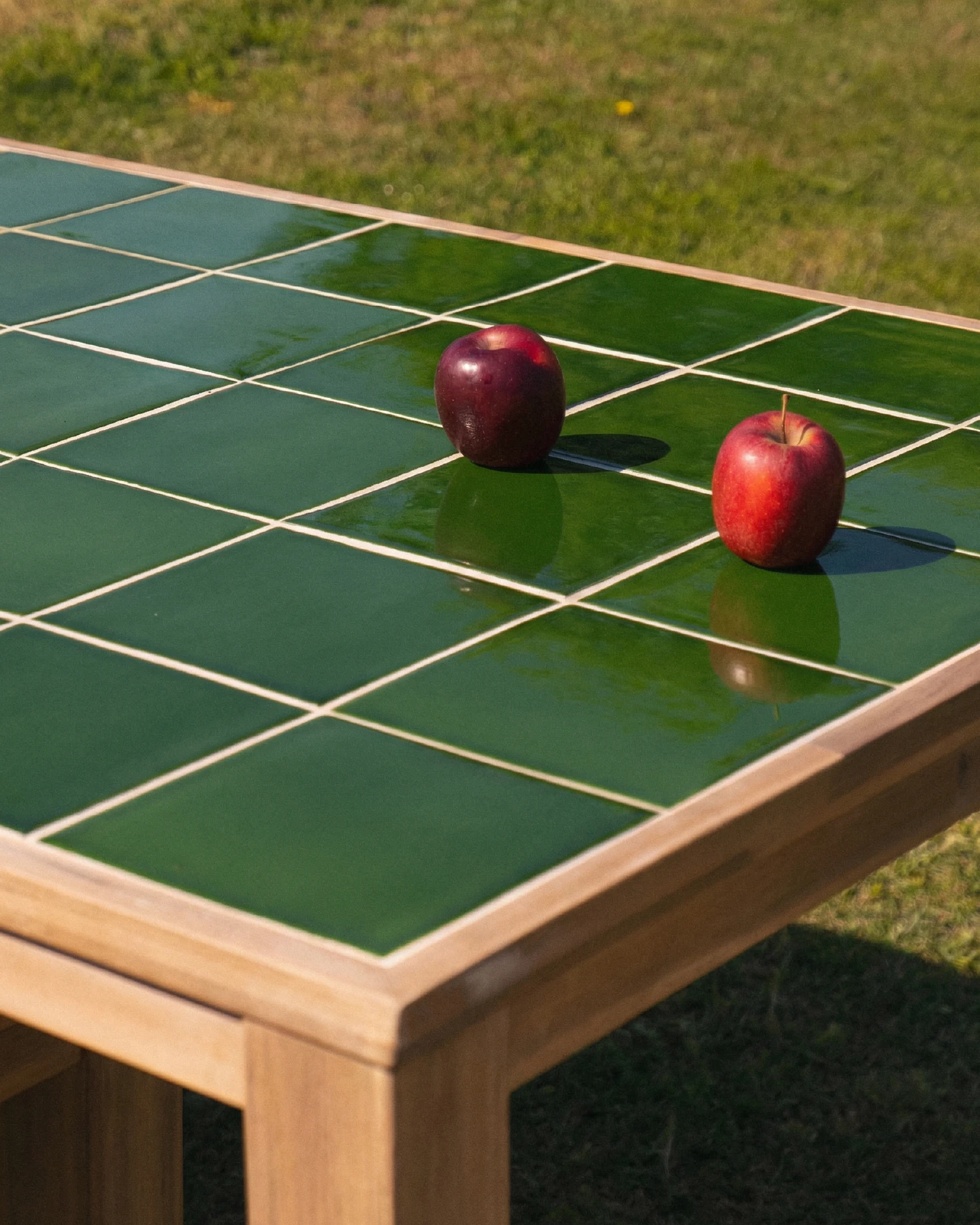 El sobre de esta mesa de cerámica está compuesto por mosaicos vidriados de 20x20 cm a color, elaborados artesanalmente por Cerámica Ferrés, de La Bisbal de Empordà (Girona). Empresa ampliamente reconocida por su tradición ceramista. Los colores de la mesa cerámica aportan vida, frescura y un aire mediterráneo, que armoniza perfectamente con la estructura de madera color claro.