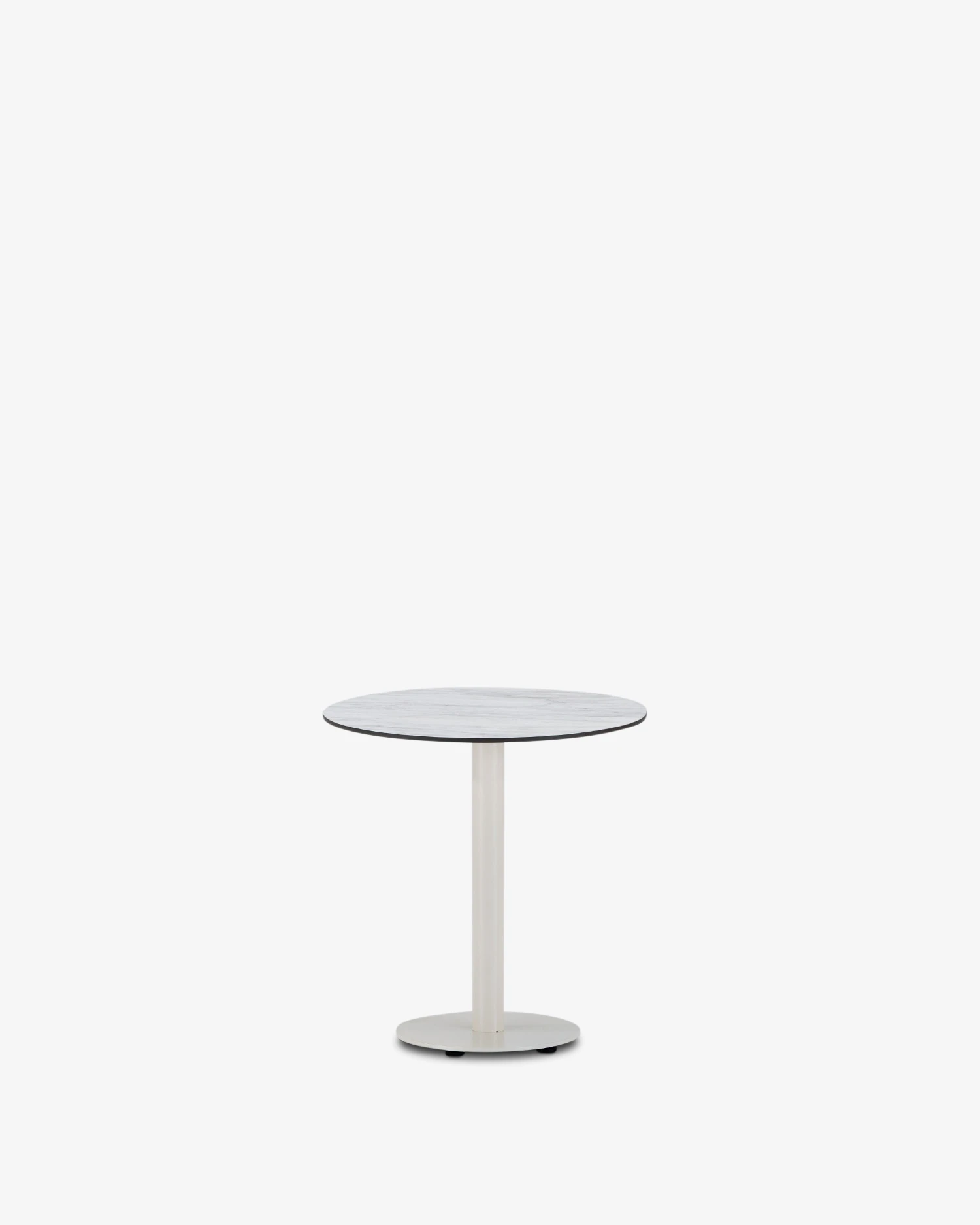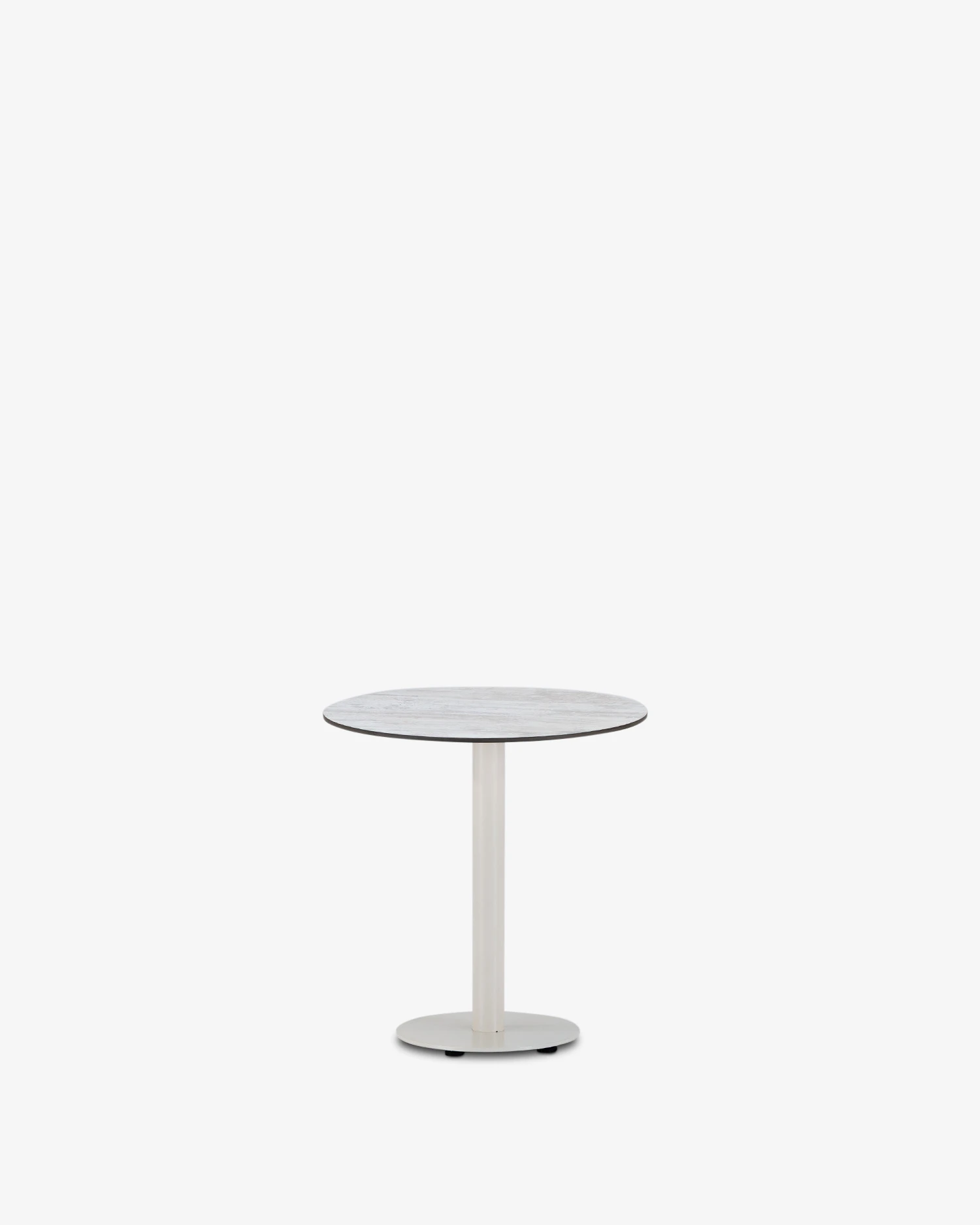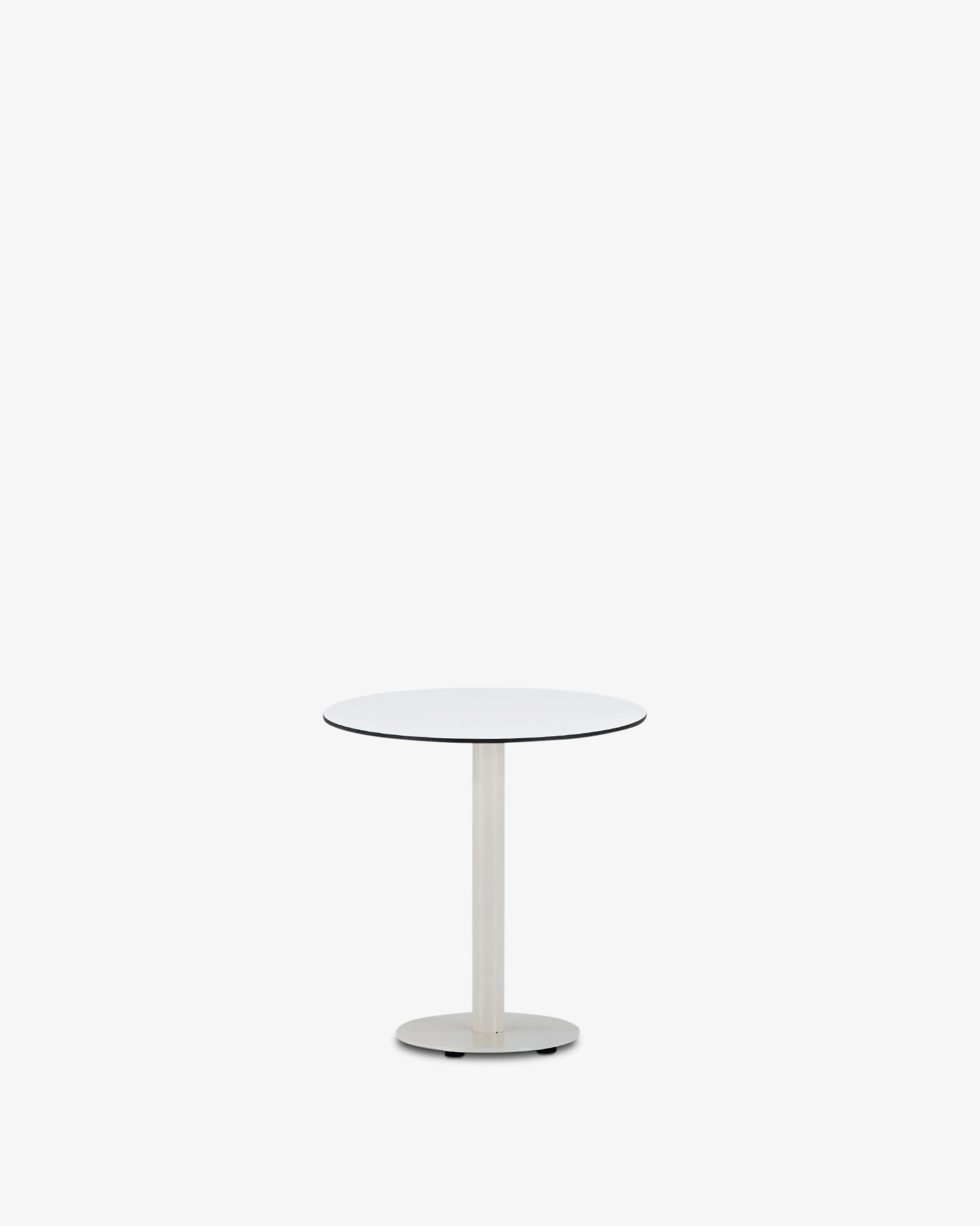 Mesa de bar de aluminio beige con pie central y sobre redondo de 70cm con tablero compacto de HPL de 10 mm de grosor.