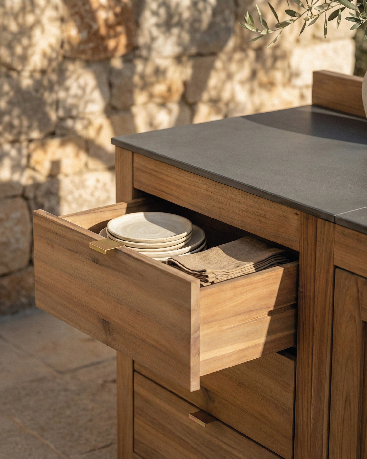 La colección de cocinas de exterior modular Valentina es funcional, versátil, muy útil y adaptable. Puedes elegir entre sus 4 modelos de módulo para configurar la cocina que más se adapte a tu espacio y necesidades. Además puedes elegir entre 4 acabados de encimera de HPL distintos, así podrás adaptarlo perfectamente a la estética de tu hogar. Un detalle importante es que todos los módulos incluyen topes regulables en altura además de ruedas. En el caso del módulo fregadero, tanto el grifo como el fregadero están incluídos.