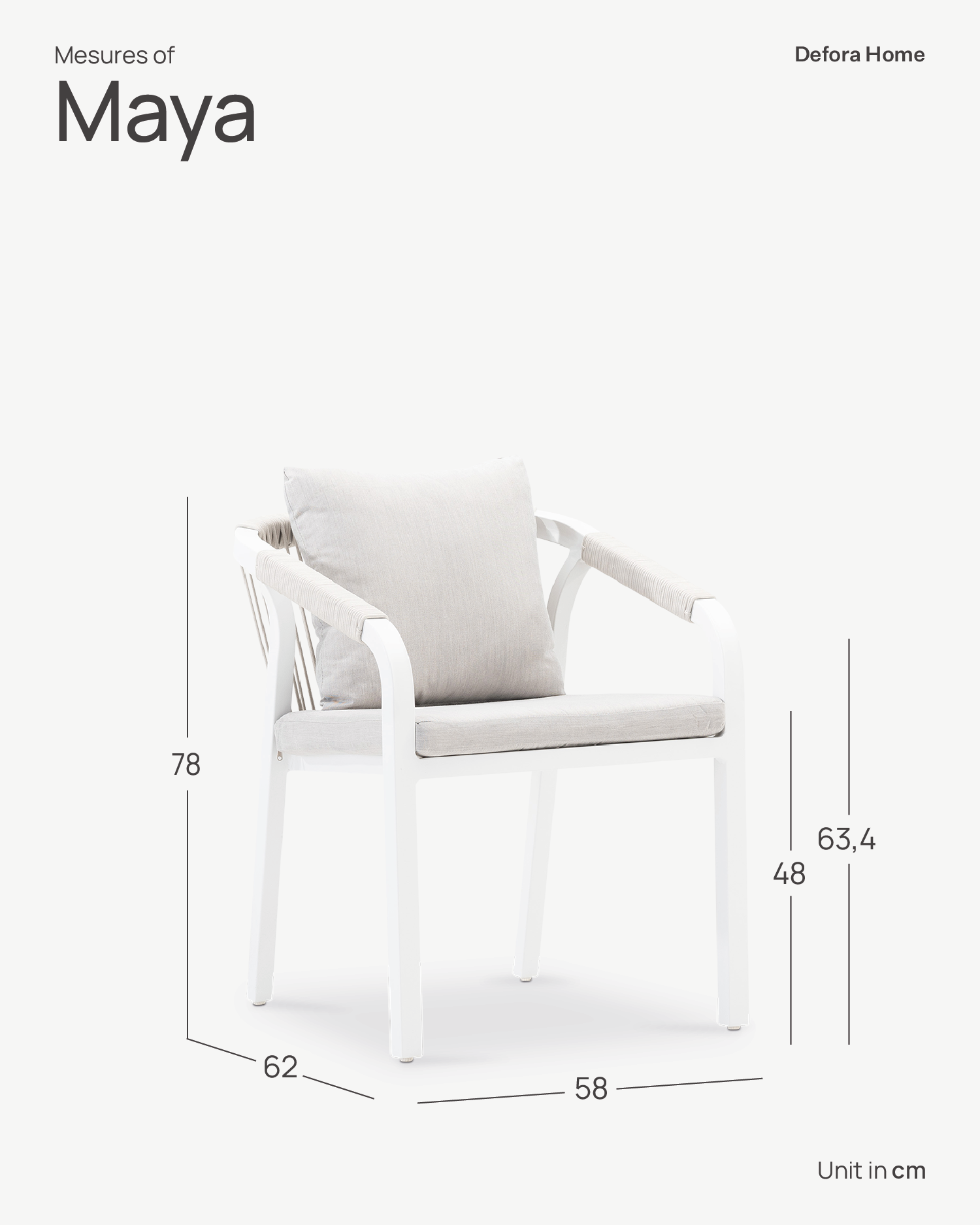 Con la elegancia de las lineas curvas y con las tonalidades modernas que permite su estructura en aluminio blanco en combinación con la cuerda y el tejido gris, así nace la colección Maya. Una colección con estrucura de aluminio blanco sobre el cual se trenza cuerda en color gris claro, además toda la cojinería es de color gris claro desenfundable y lavable. Es una gama ideal para outdoor.