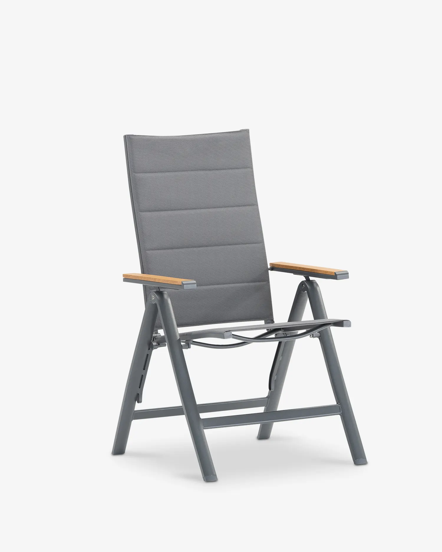 Silla con respaldo reclinable fabricado en aluminio, brazos con polywood imitando la madera y textileno acolchado. Además de muy confortable dados sus reposabrazos, es plegable, lo cual reduce enormemente el espacio de almacenaje y es muy ligera.