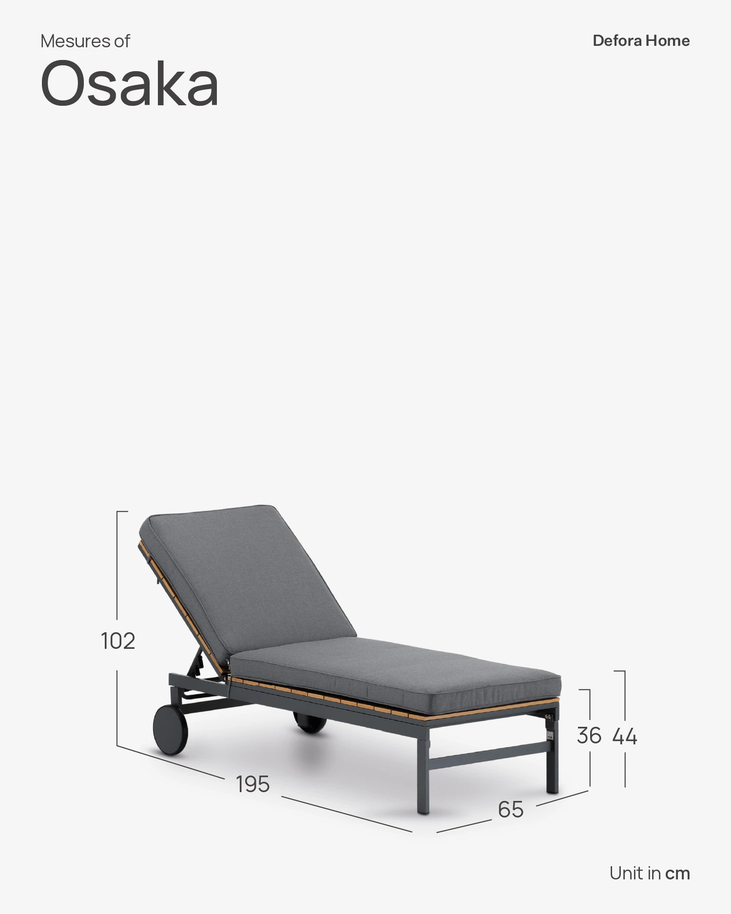 Bain de soleil en aluminium anthracite et lames imitation bois polywood pour jardin ou terrasse. L’assise et le dossier sont en lattes de polywood avec une finition imitation bois. La chaise longue Osaka a une structure solide et résistante aux intempéries, ce qui est idéal pour former un ensemble de jardin qui peut être conservé à l’extérieur toute l’année. De plus, il est inclinable et dispose de roues ce qui améliore son confort et le rend plus facile à transporter. Les lattes, étant en polywood, ont l’aspect du bois mais en éliminant l’entretien et le traitement que le bois implique, car il s’agit d’un matériau synthétique très résistant. Il comprend un coussin gris avec des sangles à attacher à la structure.