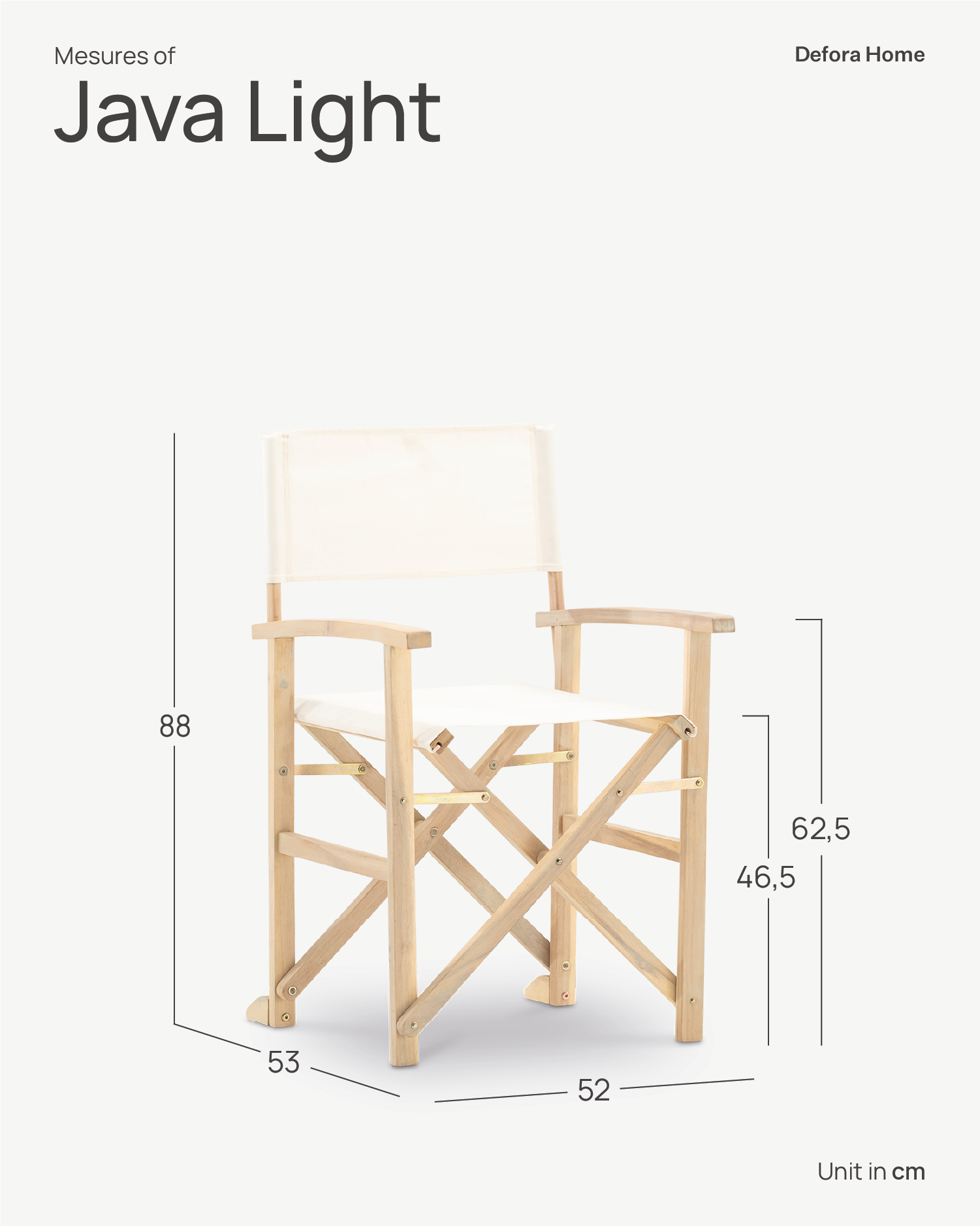 Fauteuil pliant de directeur de jardin en bois d’acacia léger et tissu brut. La chaise est pliable et très pratique. Le tissu est amovible et lavable. Fabriqué en bois d’acacia certifié FSC (garantie de forêts bien gérées sur le plan environnemental et social). Mesures 53x51x87cm. Poids 4kg