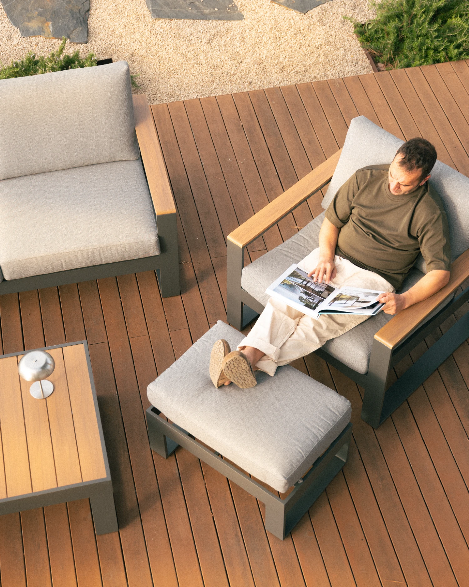 La colección Manhattan es de líneas rectas, modernas y minimalistas. Fabriqué en aluminium et une touche de chaleur fournie à la fois par ses accoudoirs et ses dessus de table, imitant le bois ainsi que le rembourrage avec un tissu texturé.