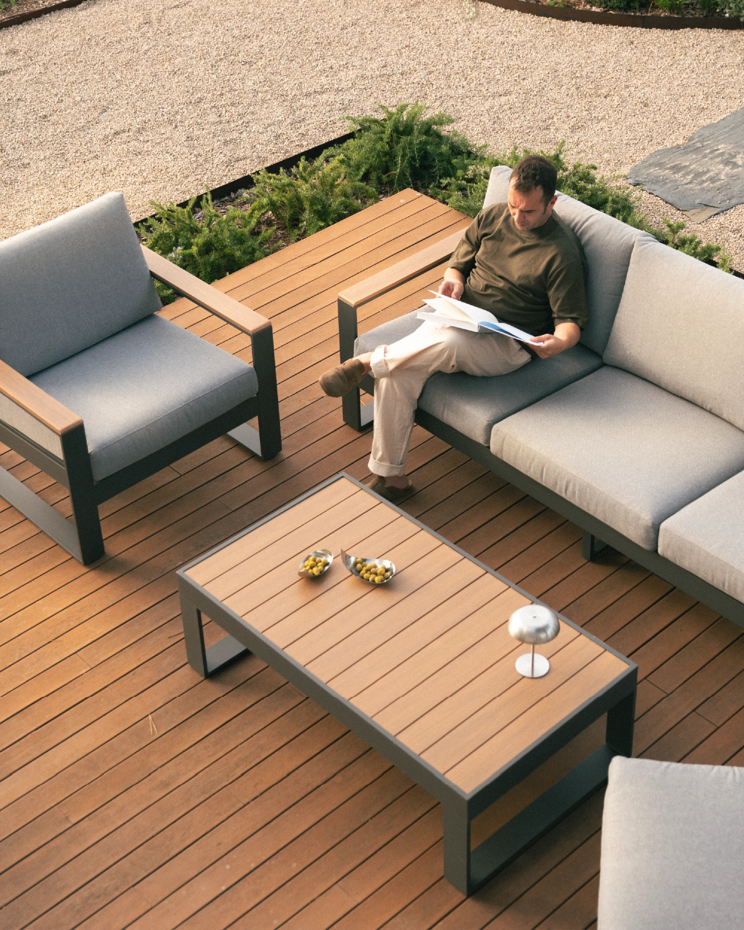 La collezione Manhattan è lineare, moderna e minimalista nelle linee. Realizzato in alluminio e un tocco di calore fornito sia dai braccioli che dai piani dei tavoli, imita il legno e l'imbottitura con tessuto strutturato.