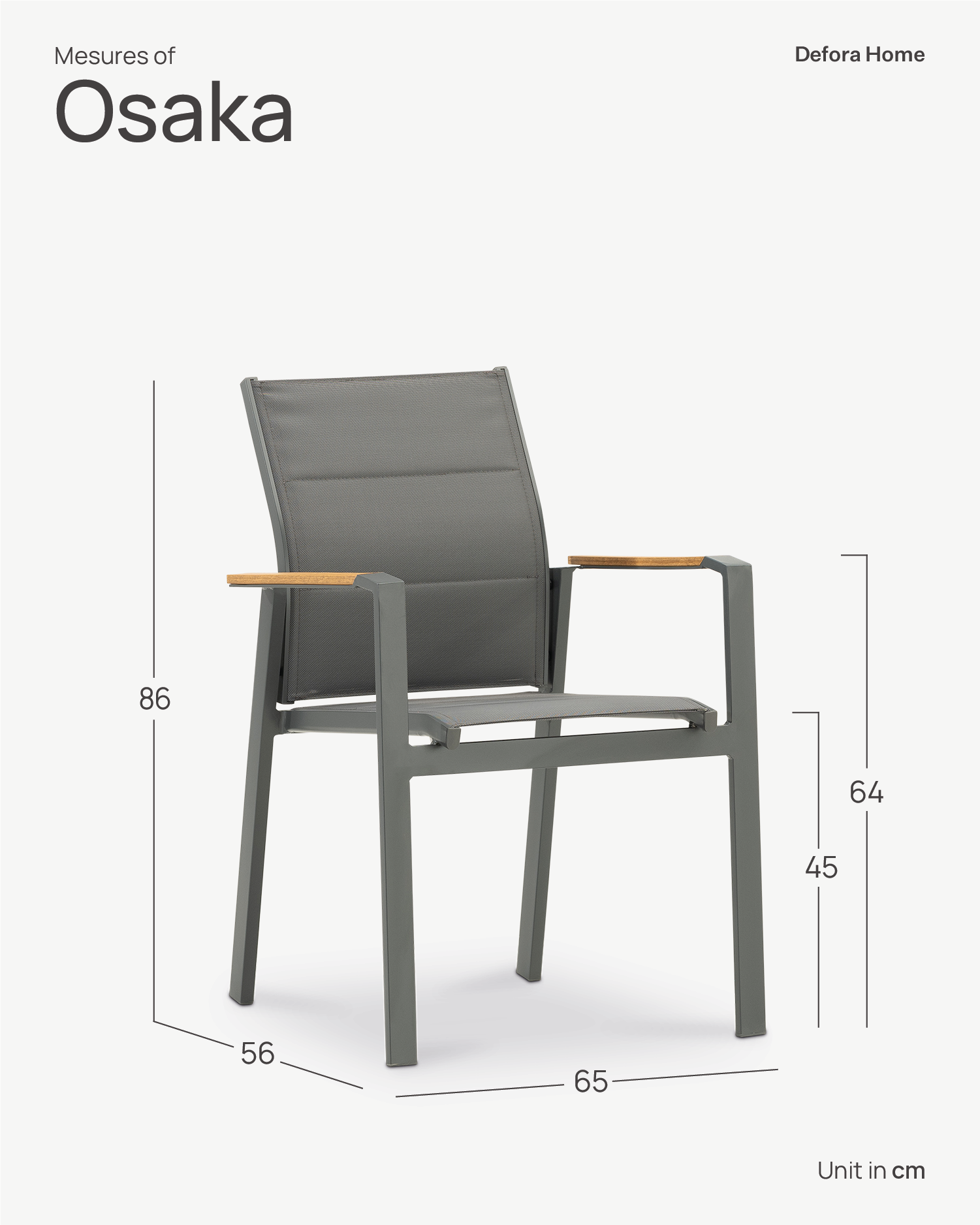 Il pacchetto di 6 sedie da giardino Osaka è realizzato in alluminio color antracite, con bracci in legno di poliuretano che imita il legno e tessuto imbottito grigio. Oltre ad essere molto comodo grazie ai suoi braccioli, è impilabile, il che riduce notevolmente lo spazio di archiviazione ed è molto leggero.