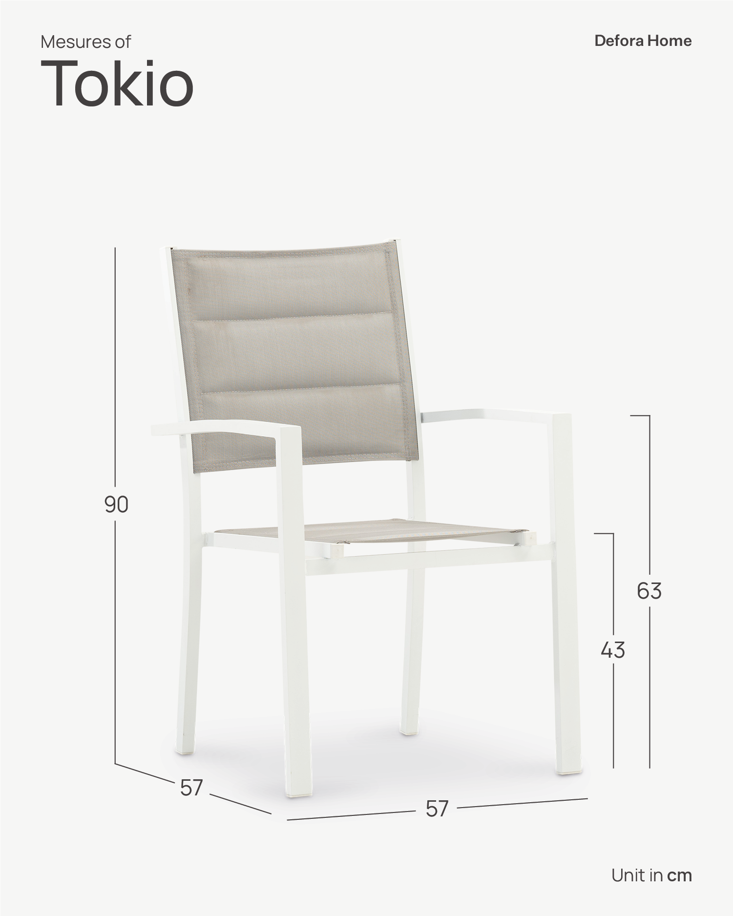 La sedia Tokyo è realizzata in alluminio bianco e tessuto imbottito grigio. Oltre a essere molto comoda grazie ai braccioli e al sedile e schienale imbottiti, è impilabile, il che riduce notevolmente lo spazio di stoccaggio ed è una sedia molto leggera.