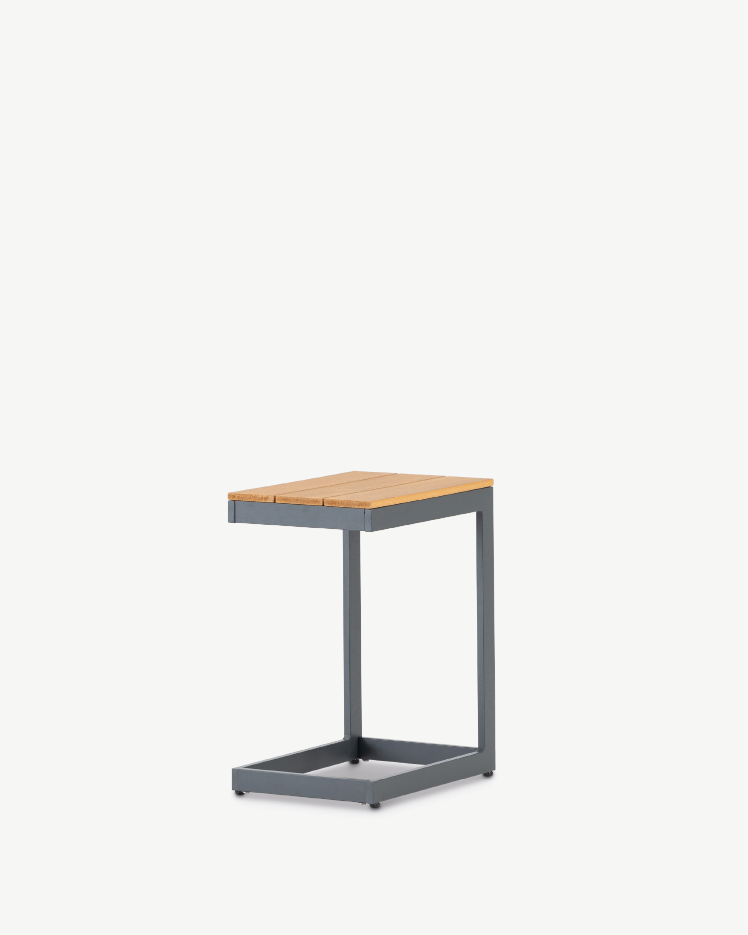 Mesa auxiliar baixa para jardim feita de alumínio cor antracite e ripas de polietileno de alta densidade que imitam madeira. As ripas, sendo feitas de polimadeira, têm o aspeto de madeira, mas eliminando a manutenção e tratamento que a madeira implica, uma vez que é um material sintético muito resistente.