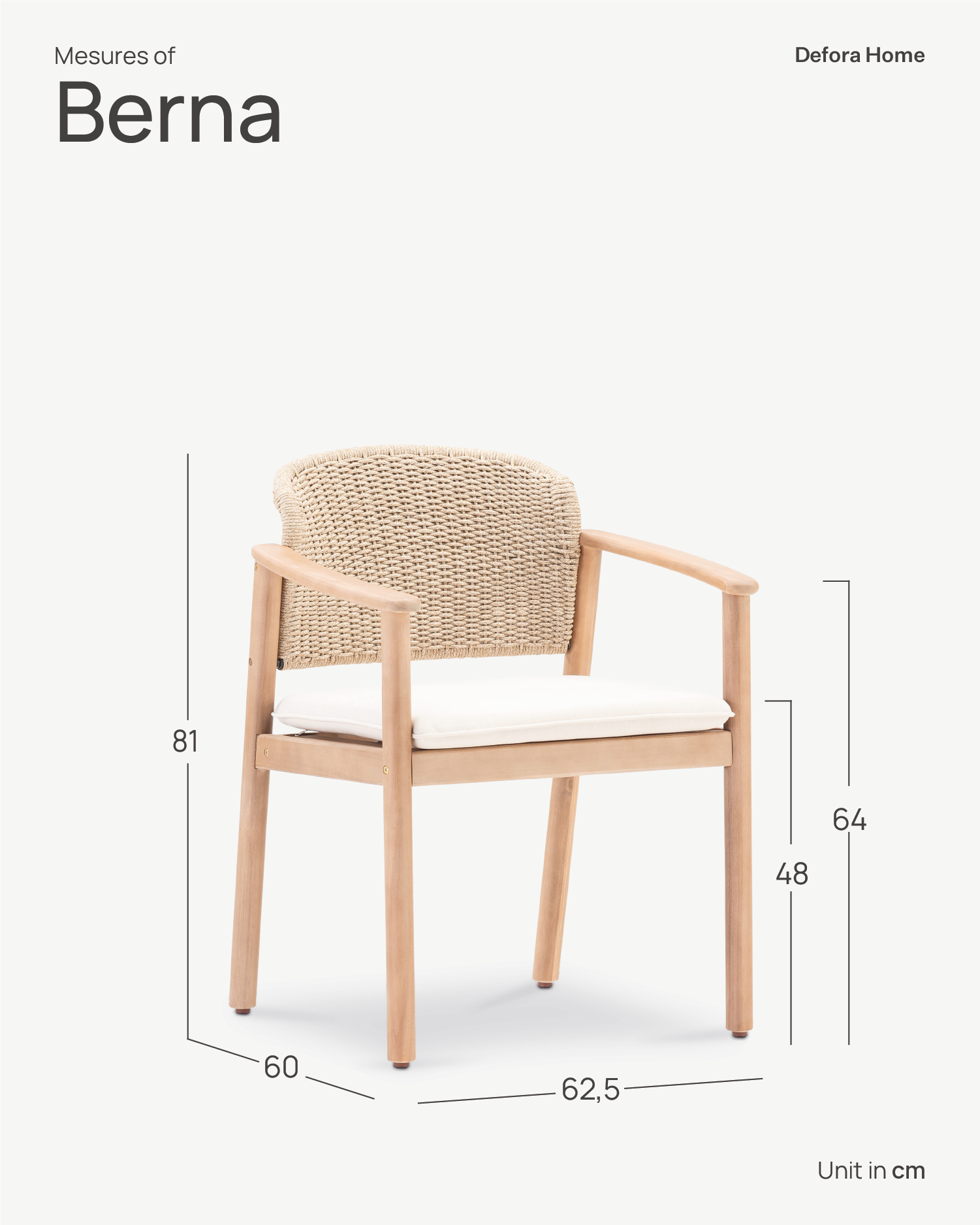 A coleção Berna, com os seus perfis arredondados, desenha silhuetas curvas em todo o seu mobiliário. Uma variedade de mobiliário em madeira que combina com encostos entrançados à mão, corda bege e almofadas removíveis em cor ecru.