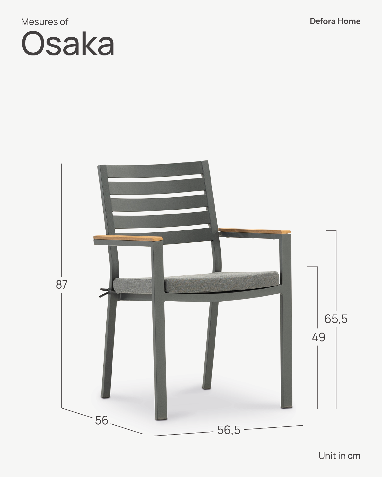As cadeiras de antracite de Osaka são feitas de alumínio antracite e os braços em madeira de poliuretano que imitam madeira. Além de ser muito confortável devido aos seus apoios de braços, é empilhável, o que reduz muito o espaço de armazenamento e é muito leve. As cadeiras vêm com uma almofada cinzenta que é removível e fácil de lavar.