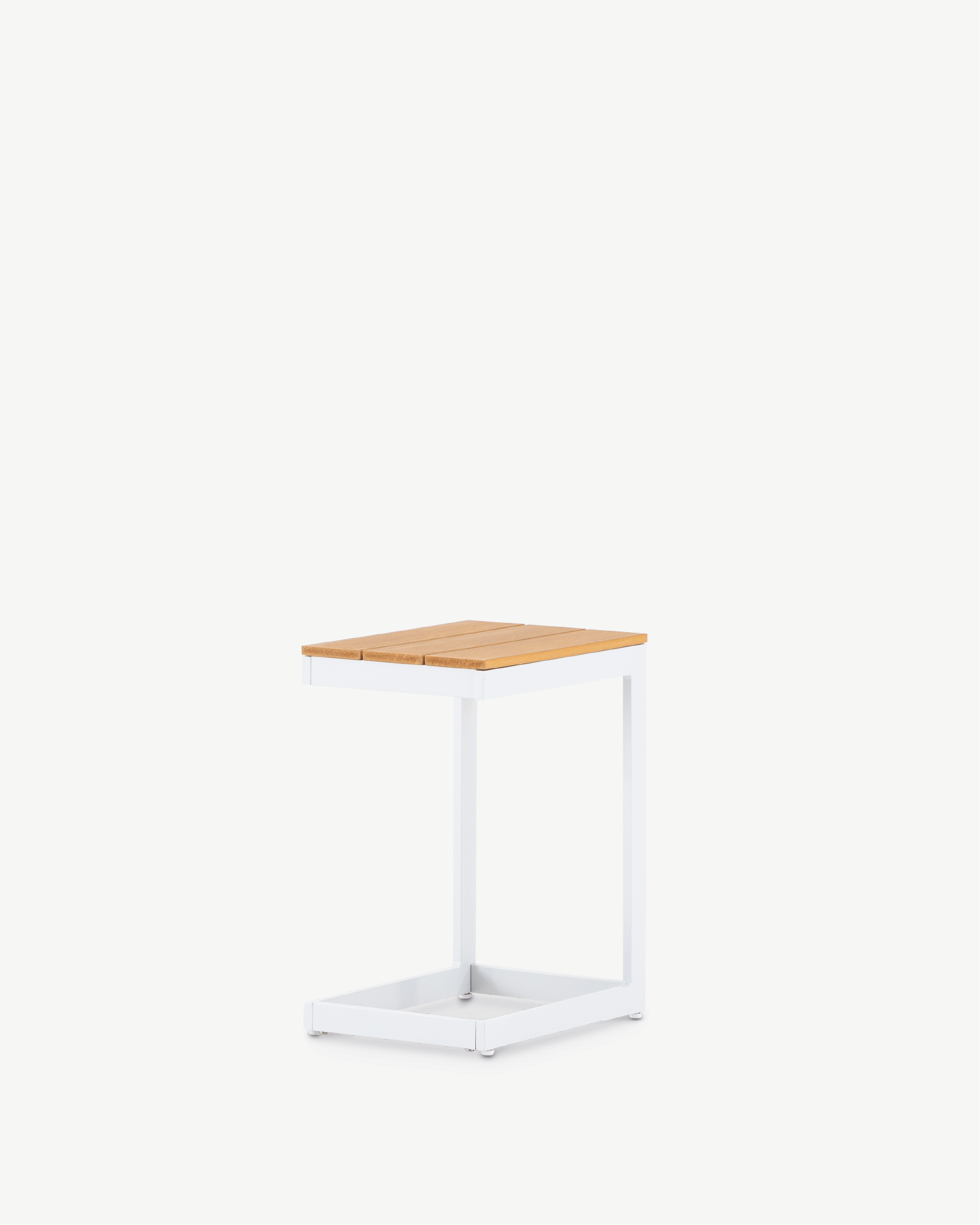 Mesa auxiliar baixa para jardim feita de alumínio branco e ripas de polietileno de alta densidade que imitam madeira. As ripas, sendo feitas de polimadeira, têm o aspeto de madeira, mas eliminando a manutenção e tratamento que a madeira implica, uma vez que é um material sintético muito resistente.